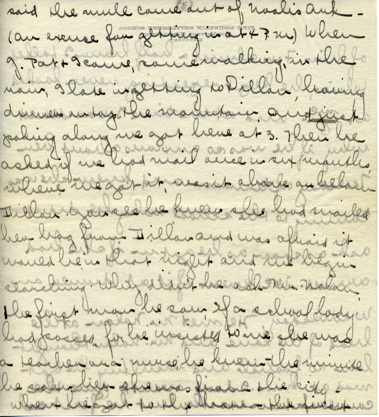 He met Mr. Nolan at the head of the lane and Mr. Nolan thought him so foolish and insulting he got mad at him. I don’t want to give the conversation exactly but he first said the mule came out of Noah’s Ark – (an excuse for getting in at 4 P M). When J. Pat and I came, some walking, in the rain, I late in getting to Dillon, having dinner on top of the mountain and just poking along we got here at 3. Then he asked if we had mail once in six months, where we got it, was it above or below Dillon. You see he knew she had mailed her bag from Dillon and was afraid it would be in that night and we begin searching.