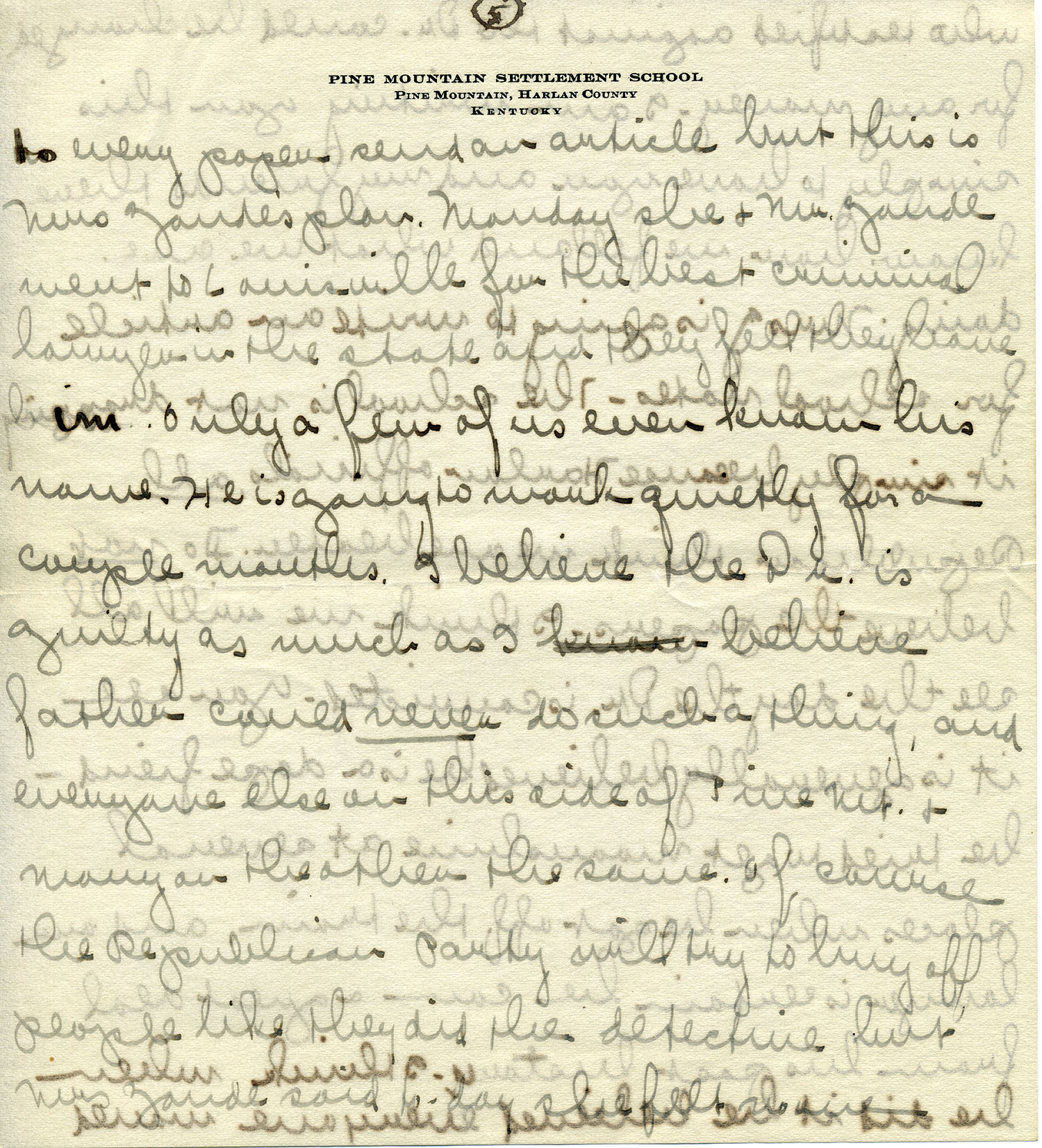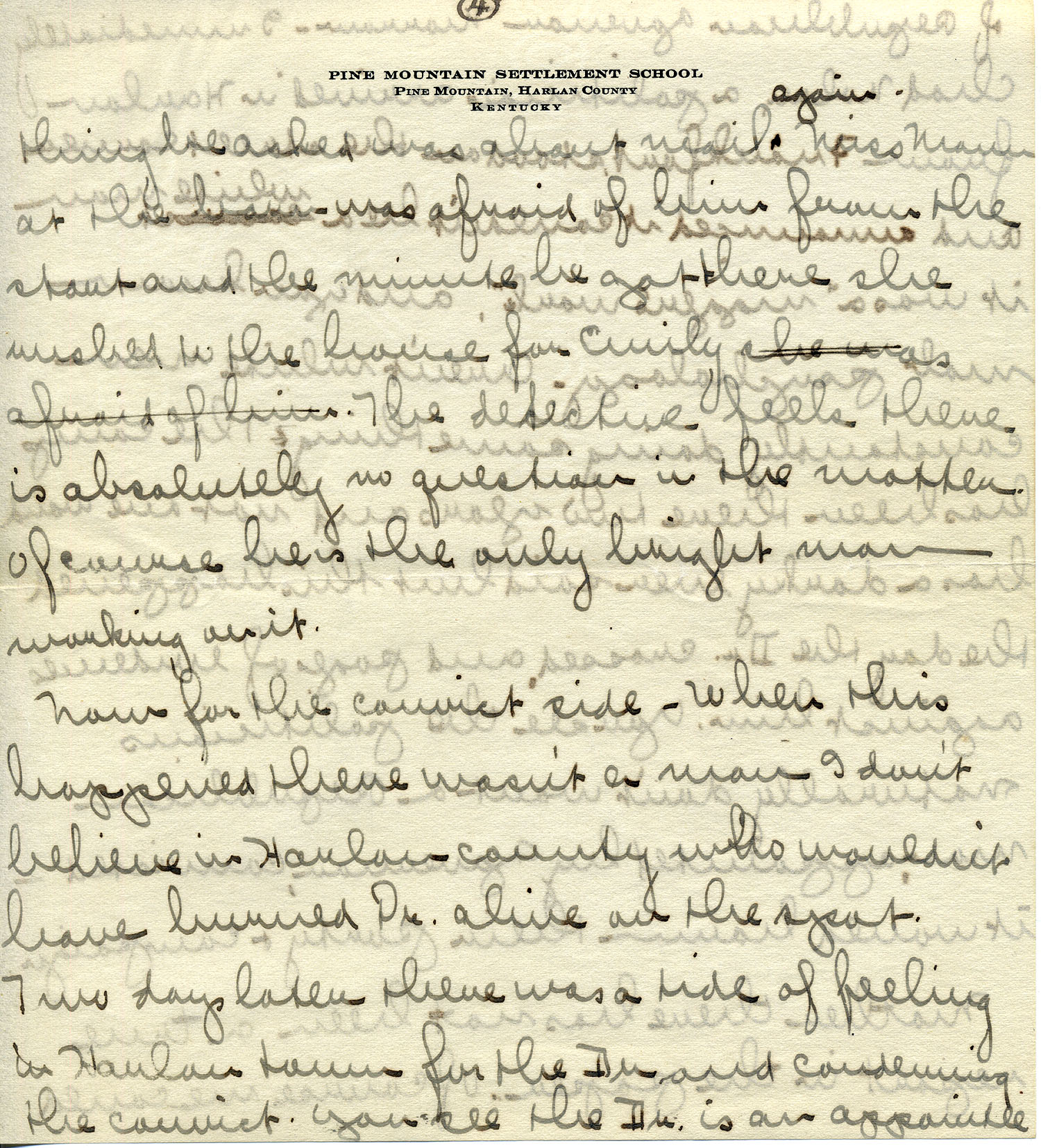 said today she felt no one who testified against the doctor could be changed for any money. I am writing you this simply to have you and my friends there know how we feel and what we are doing. Mrs. Z. is going to write an article for school notes. The school is not dropping it simply because Harlan officials, all Republican, think we are beaten. Do not believe the papers. I think we will all see the day the Dr. is convicted. You see it is generally believed he is a dope fiend — he tried to get moonshine at several places when he got off the train, and our lawyer is certain he [c….?] a great deal from his past history. I think when he did it he believed everyone would lay it on a convict. That was his outlet — and this all shows, Mother, that the mountains are safer than the city, for it takes a city man and thank goodness, our country men could not do it.