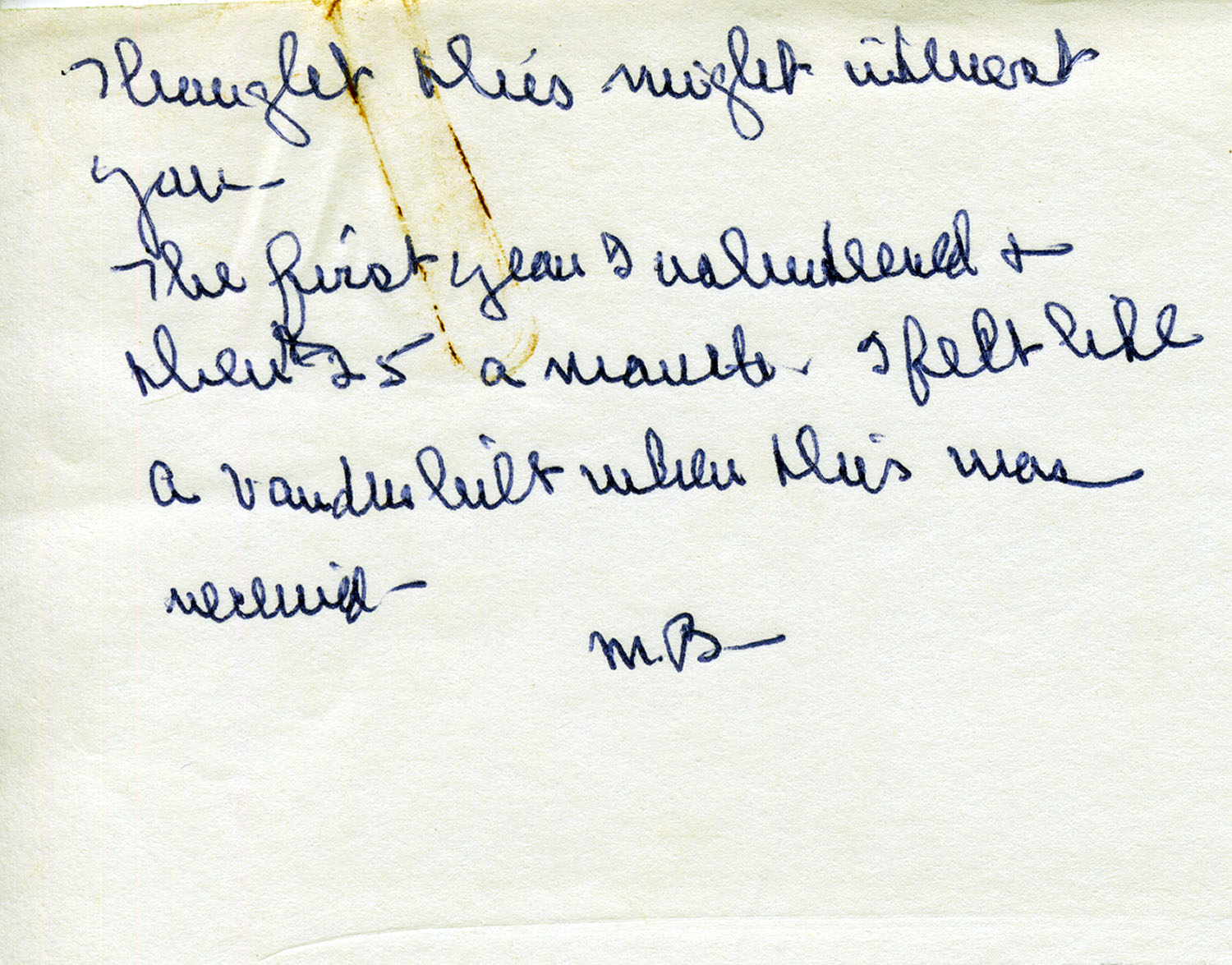 MBB Note: “Thought this might interest you. The first year I volunteered & then $25 a month. I felt like a Vanderbilt when this was received. M.B.” [image 079]