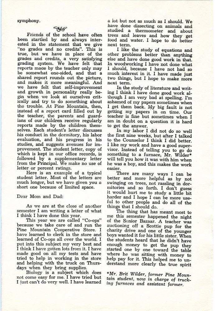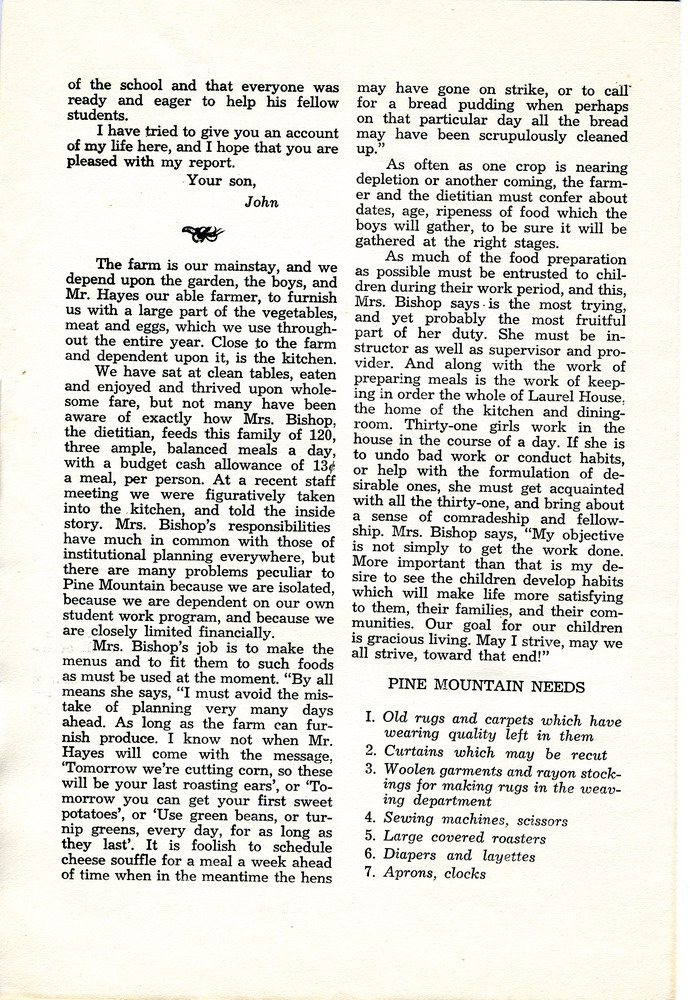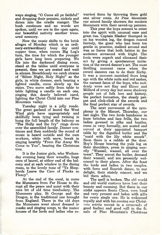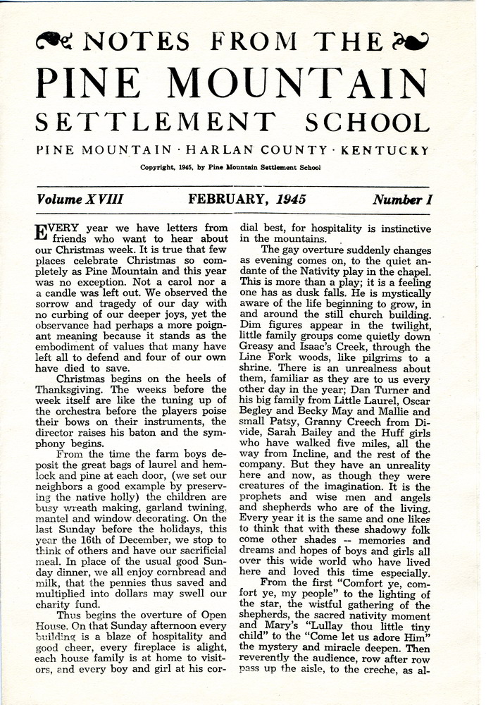 NOTES – 1945 FEBRUARY: Christmas ; Open House ; Nativity play ; Mummers ; evaluation letters to parents ; education ; cooking ; needs ; Oscar Begley ; Dan Turner ; Becky May ; Granny Creech ; Sarah Bailey ; Captain Slasher ; Mrs. Birdena Bishop ; Mr. William Hayes ; Pine Mountain Cooperative Store ; Brit Wilder ; farm ; dietician ;