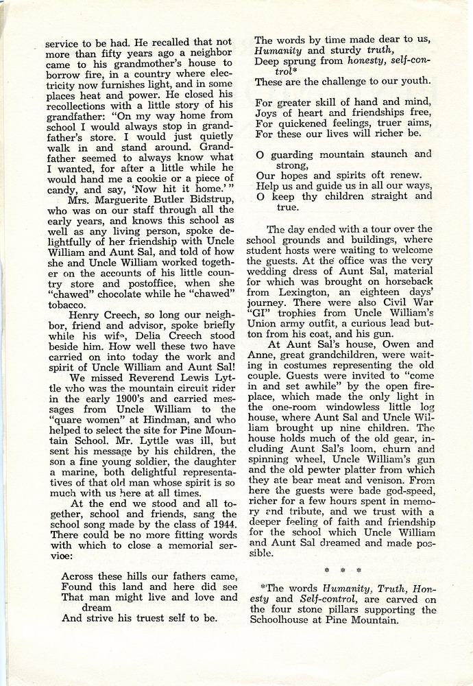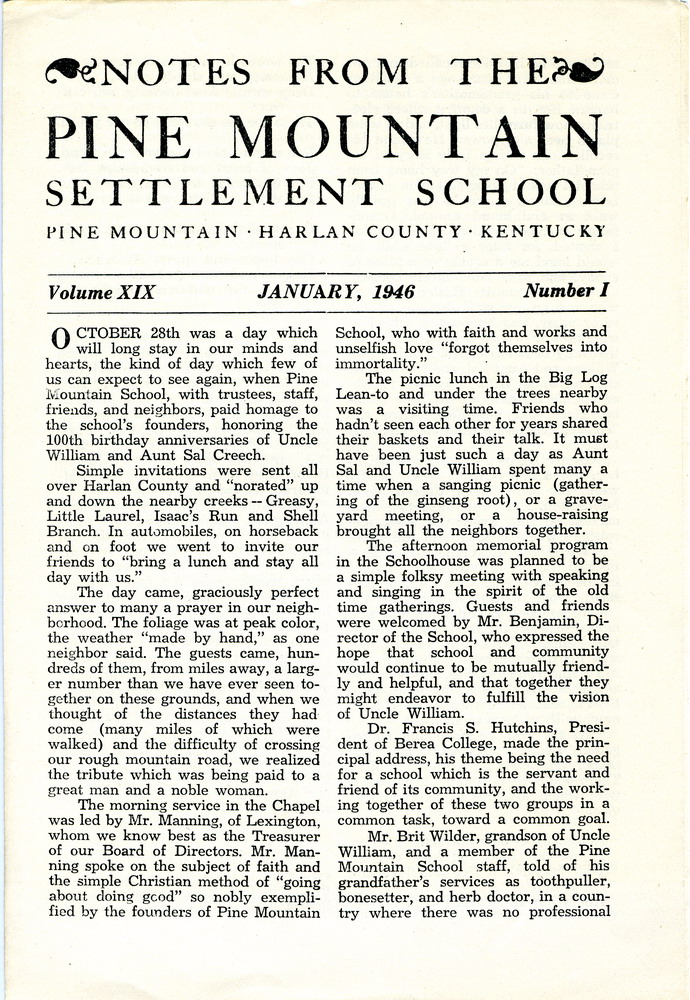 NOTES – 1946 JANUARY: 100th birthday anniversary ; Mr. Manning ; Big Log ; Lean-to ; Schoolhouse ; Mr. Benjamin ; Dr. Francis S. Hutchins ; Brit Wilder ; Mrs. Marguerite Butler Bidstrup ; Henry Creech ; Delia Creech ; Rev. Lewis Lyttle ; school song ; lyrics ; religion ; linguistics ; The Pine Cone ; picnics ; Little Laurel ; Isaac’s Run ; Shell Branch ;