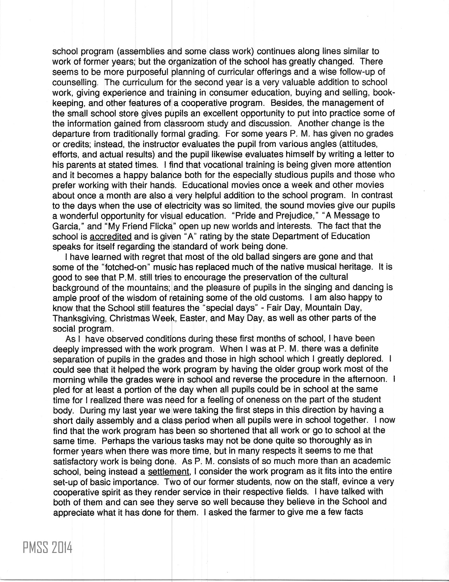 As P. M. consists of so much more than an academic school, being instead a settlement. I consider the work program as it fits into the entire set-up of basic importance. Two of our former students, now on the staff, evince a very cooperative spirit as they render service in their respective fields. I have talked with both of them and can see they serve so well because they believe in the School and appreciate what it has done for them. I asked the farmer [William Hayes] to give me a few facts