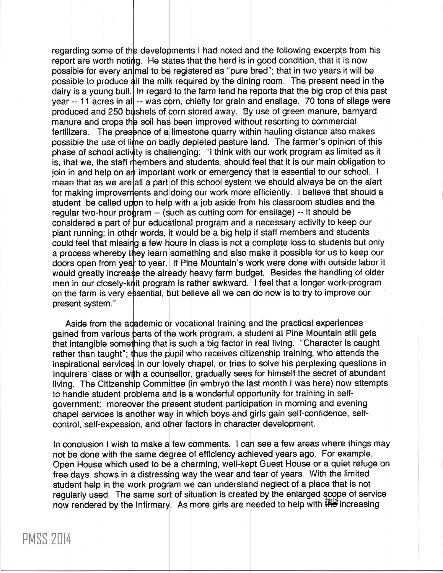 Though there are many material or visual changes here which I have noted, these features remain largely unchanged: the ever-enthusiastic, hopeful boys and girls: the staunch, friendly neighbors and ever-widening community to be served; the deep, underlying spirit pervading Pine Mountain through the years; and our guarding mountains. These I hope will abide forever!