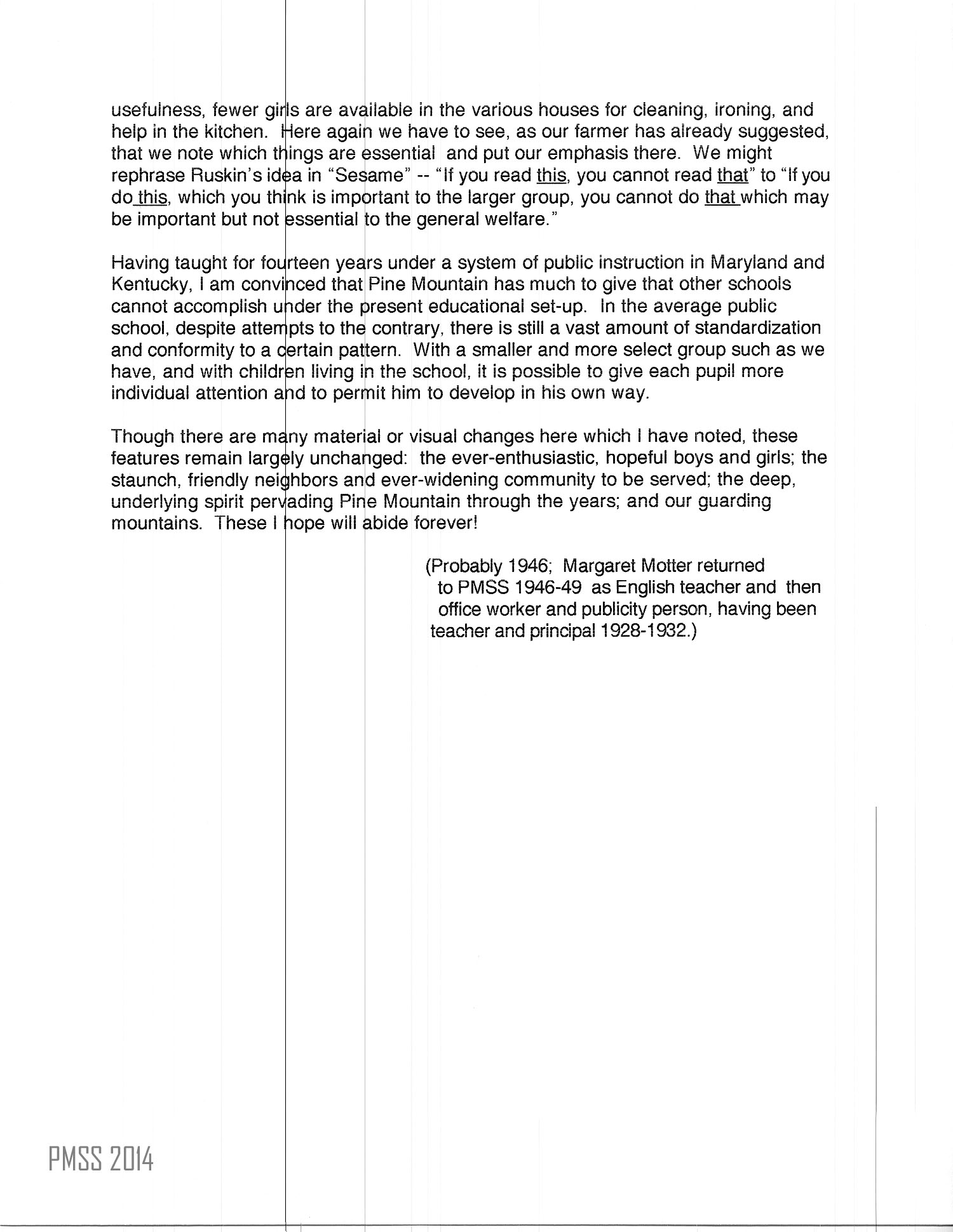 (This essay was probably written in 1946. Margaret Motter returned to work at PMSS 1946-1949 as English teacher and then office worker and publicity person. She had been a teacher and principal from 1928 to 1932.)