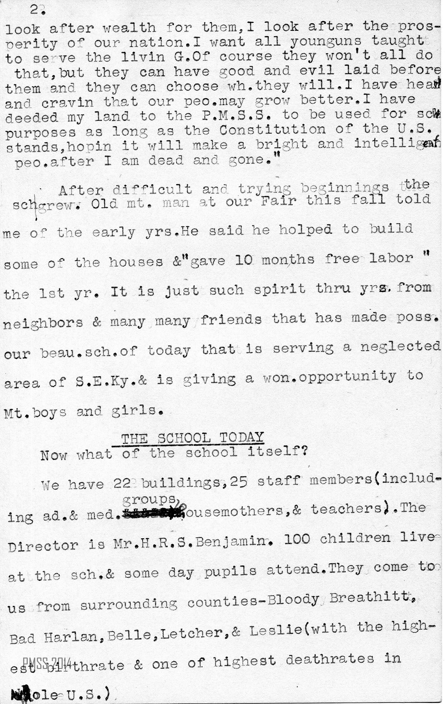 Long years ago a mountain man with a third grade education who lived in South Eastern Kentucky had a dream of a school for his children, grands, great-grands, and neighbors. For thirty years he dreamed; then he heard of a school about forty miles away. [He] sent word — [like MacCall ?] and two ladies came in answer to his call. How did the dream unfold? He gave 136 acres — all he had & with deed wrote in his unlettered hand some priceless words — words that we cherish because we consider his document the ever recurring challenge to us to carry on —