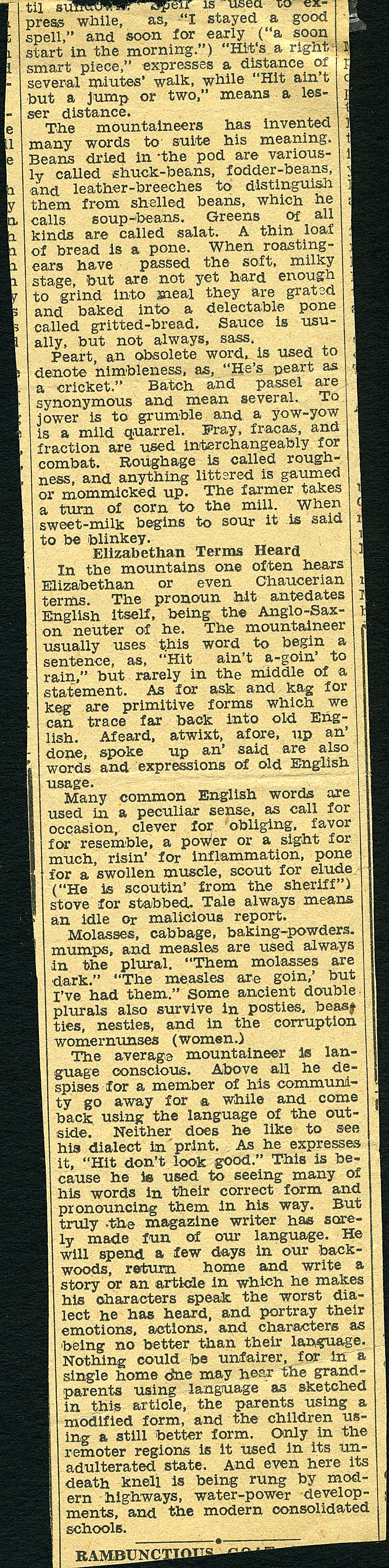 SCRAPBOOK BEFORE 1929: “Highways and Schools Sounding Death Knell of Mountain Dialect” n.d.