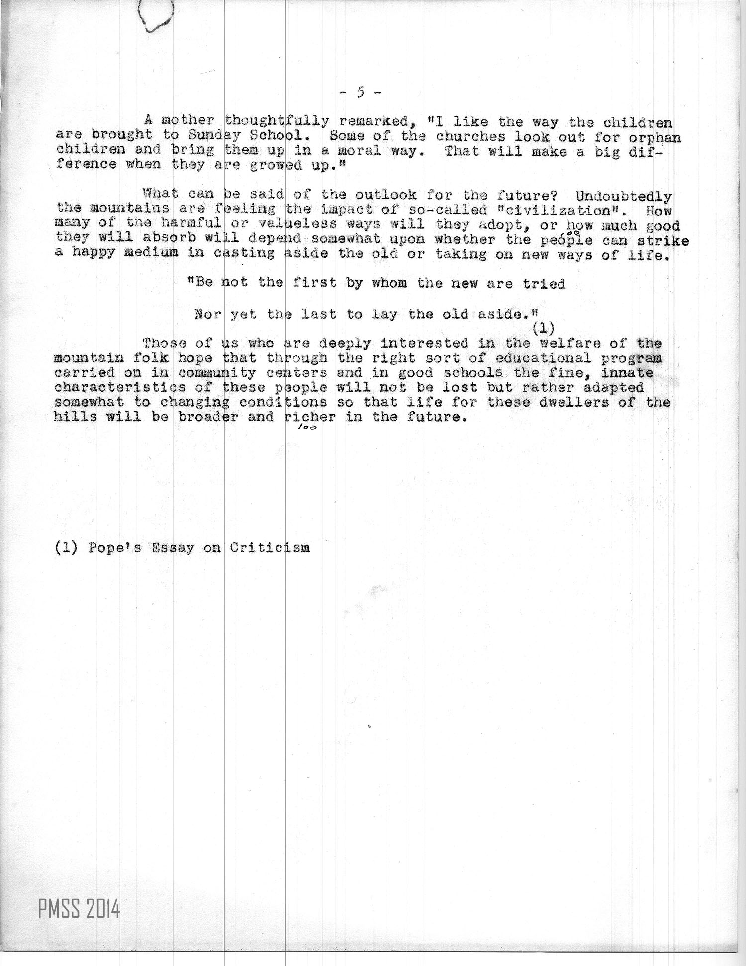 Those of us who are deeply interested in the welfare of the mountain folk hope that through the right sort of educational program carried on in community centers and in good schools, the fine, innate characteristics of these people will not be lost but rather adapted somewhat to changing conditions so that life for these dwellers of the hills will be broader and richer in the future.