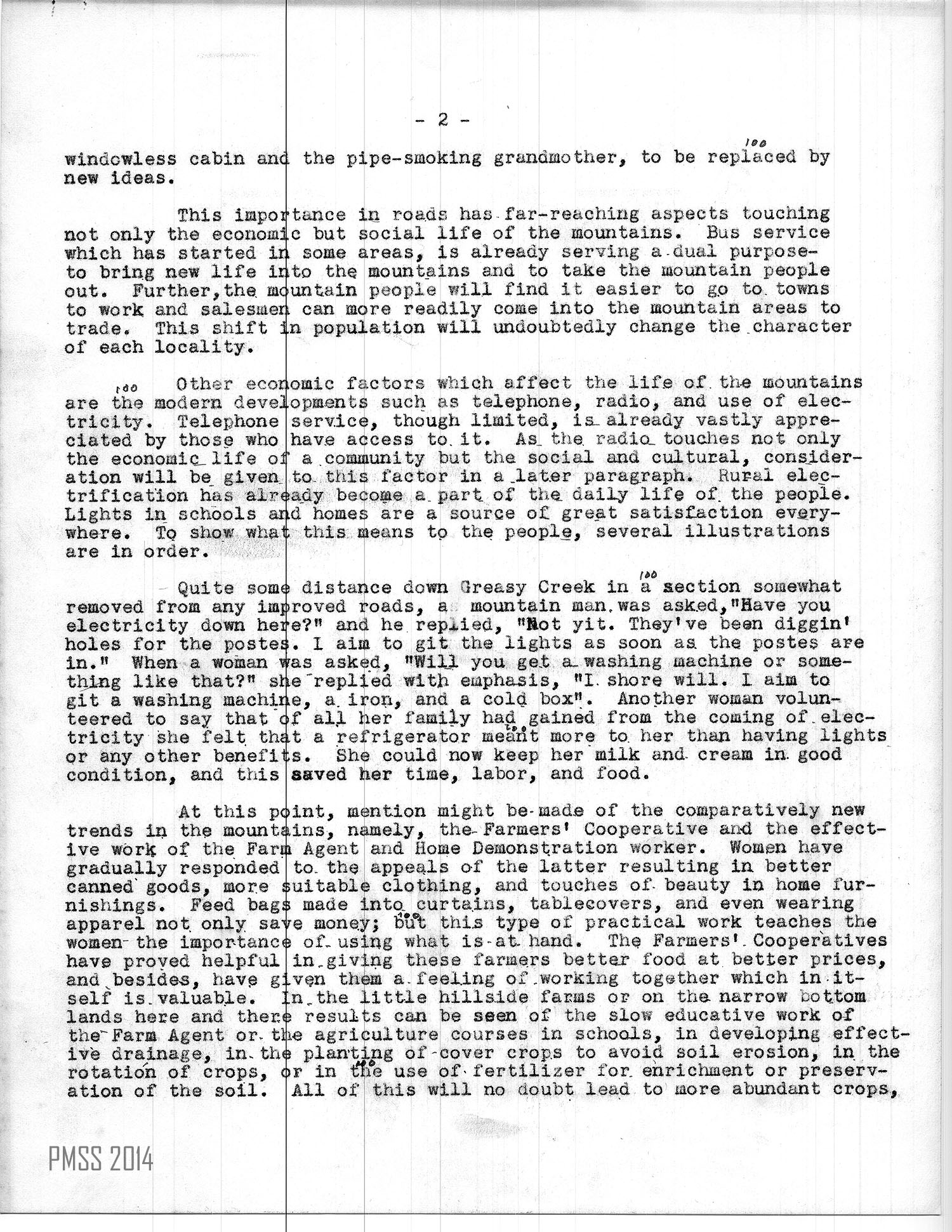 Miss Motter describes changes in the mountain area since 1929 ; extension and improvement of roads due to logging and mining needs ; social and economic changes brought by roads ; changes brought by telephone, radio, and electricity ; new trends brought by Farmers’ Cooperative, Farm Agent and Home Demonstration workers ; changes in family life brought by schools, public health programs, etc. ; health care improvements ; new ideas brought in by returning children ; increased church attendance ; hope for future ;