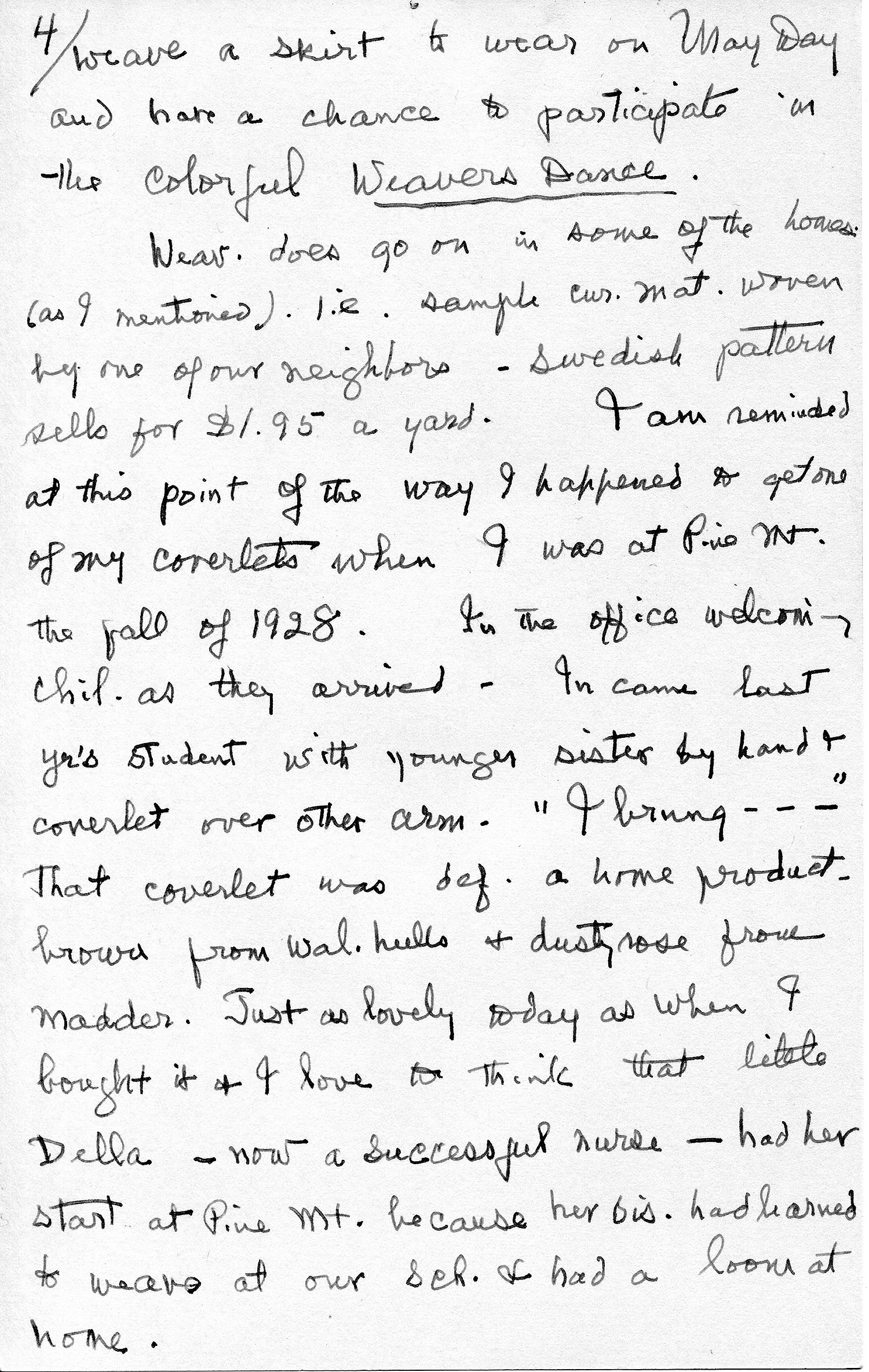 [page 4]…weave a skirt to wear on May Day and have a chance to participate in the colorful Weavers Dance. Weav. does go on in some of the homes (as I mentioned): i.e., sample cur. mat. woven by one of our neighbors — Swedish pattern sells for $1.95 a yard. I am reminded at this point of the way I happened to get one of my coverlets when I was at Pine Mt. the fall of 1928. In the office welcoming chil. as they arrived — In came last yr’s student with younger sister by hand & coverlet over other arm. “I brung….” That coverlet was def. a home product, brown from wal. hulls & duty rose from madder. Just as lovely today as when I bought it & I love to think that little Della — now a successful nurse — had her start at Pine Mt. because her sis. had learned to weave at our Sch. & had a loom at home.