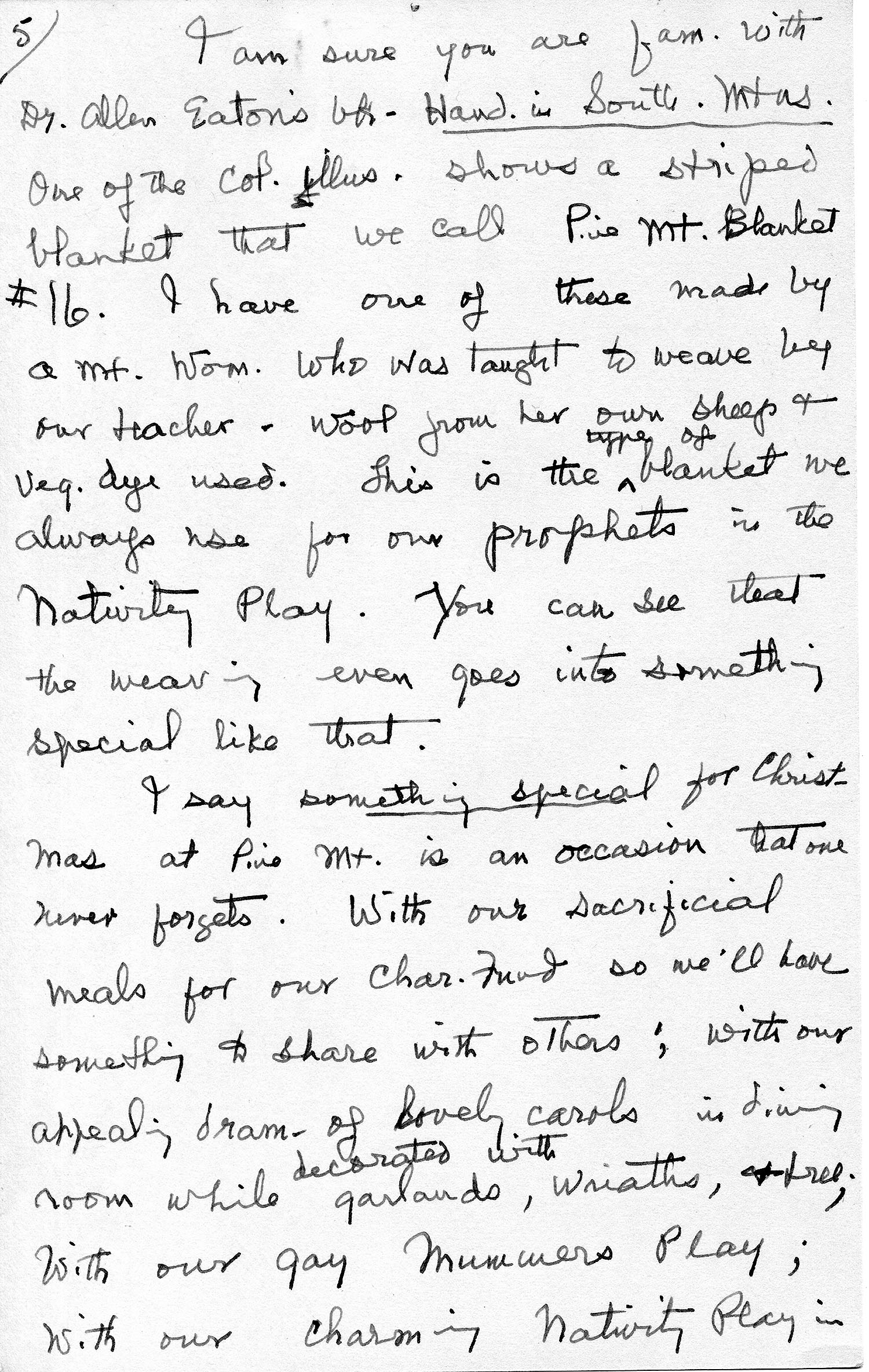 [page 5] I am sure you are fam. with Dr. Allen Eaton‘s bk — Hand. in South. Mtns. One of the col. illus. show a striped blanket that we call Pine Mt. Blanket #16. I have one of these made by a mt. wom. who was taught to weave by our teacher. Wool from her own sheep & veg. dye used. This is the type of blanket we always use for our prophets in the Nativity Play. You can see that the weaving even goes into something special like that.