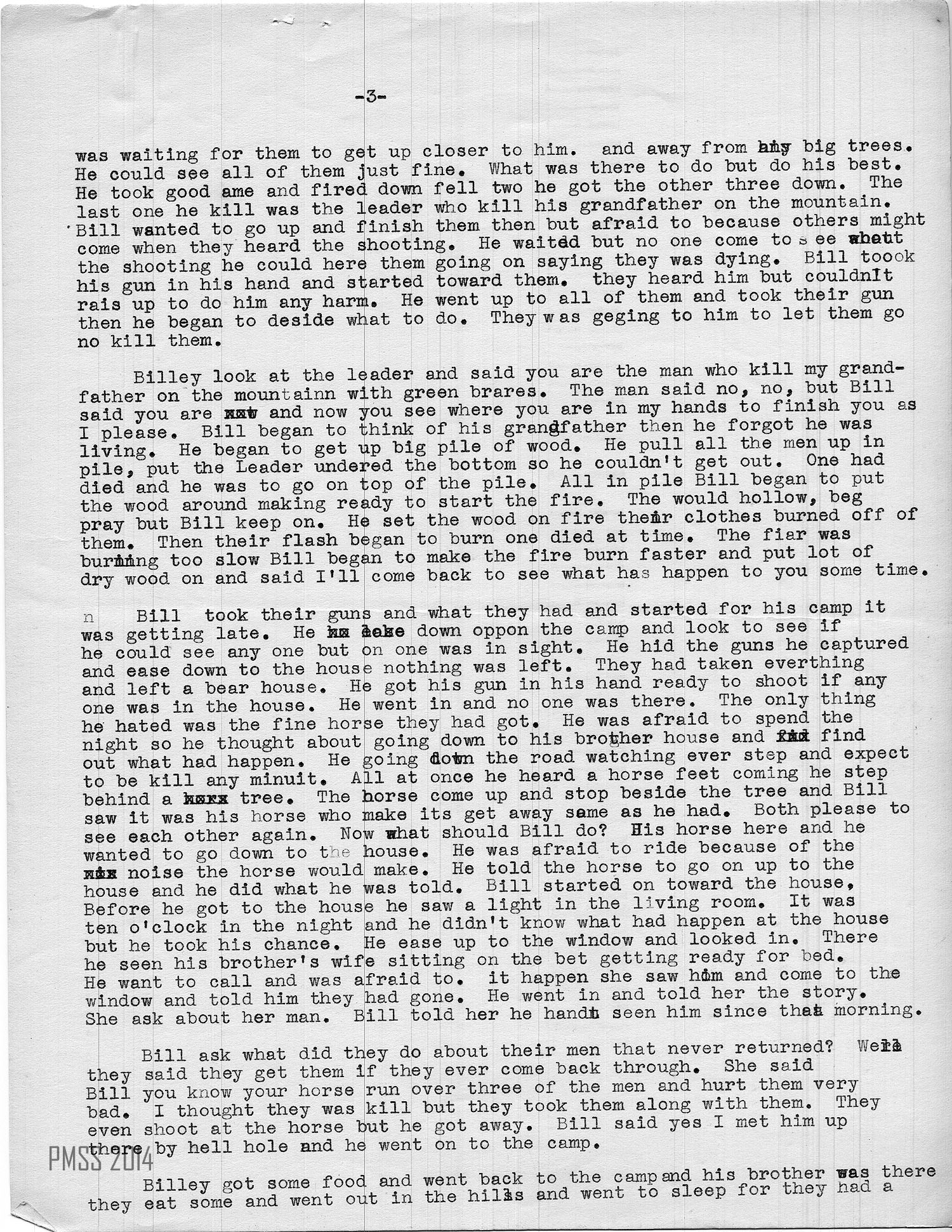 Billy look at the leader and said, you are the man who kill my grandfather on the mountain with green brars. The man said, no, no, but Bill said, you are and now you see where you are in my hands to finish you as I please. Bill began to think of his grandfather then he forgot he was living. He began to get up big pile of wood. He pull all the men up in pile, put the leader under the bottom so he couldn’t get out. One had died and he was to go on top of the pile. All in pile, Bill began to put the wood around, making ready to start the fire. They would hollow, beg, pray, but Billy keep on. He set the wood on fire, their clothes burned off of them. Then their flesh began to burn. One died at [a] time. The fire was burning too slow. Bill began to make the fire burn faster and put [a] lot of dry wood on and said, I’ll come back to see what has happen to you some time.