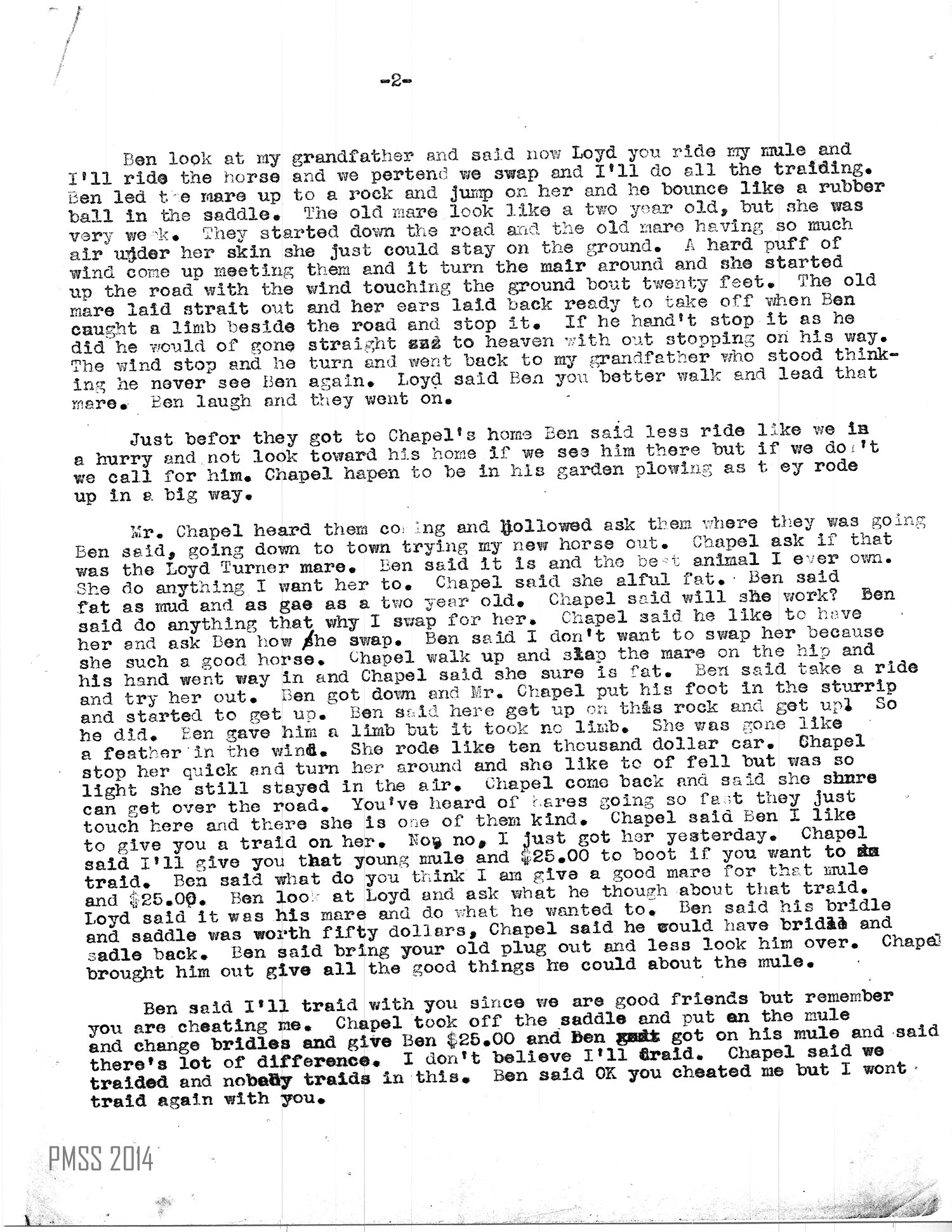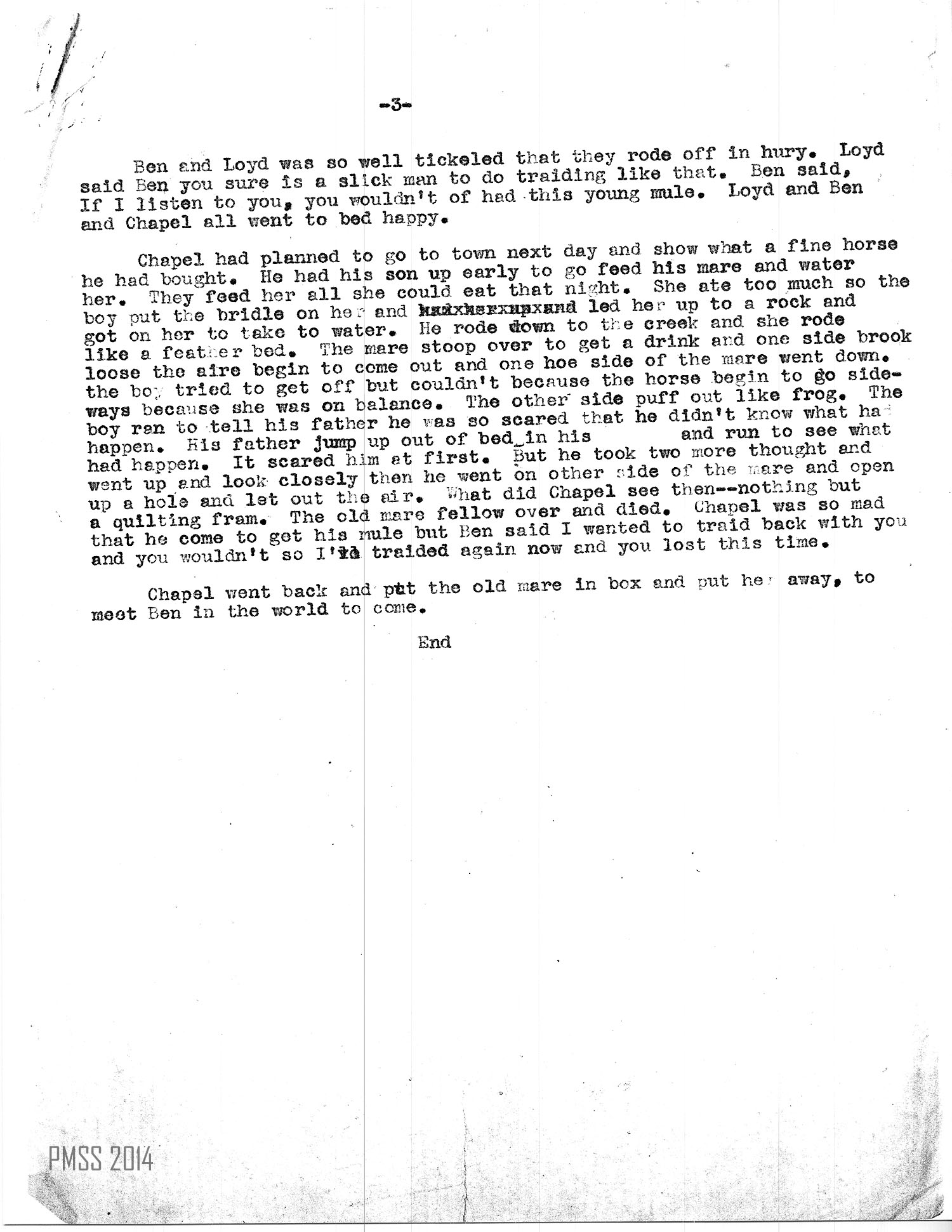 Chapel had planned to go to town next day and show what a fine horse he had bought. He had his son up early to go feed his mare and water her. They feed her all she could eat that night. She ate too much so the boy put the bridle on her and led her up to a rock and got on her to take to water. He rode down to the creek and she rode like a feather bed. The mare stoop over to get a drink and one side broke loose, the air begin to come out and one whole side of the mare went down. The boy tried to get off but couldn’t because the horse begin to go sideways because she was on balance. The other side puff out like [a] frog. The boy ran to tell his father he was so scared that he didn’t know what had happen. His father jump up out of bed in his [….?] and run to see what had happen. It scared him at first. But he took two more thoughts and went up and look closely, then he went on other side of the mare and open up a hole and let out the air. What did Chapel see then — nothing but a quilting frame. The old mare fell over and died. Chapel was so mad that he come to get his mule, but Ben said, I wanted to trade back with you and you wouldn’t, so I’ve traded again now and you lost this time.