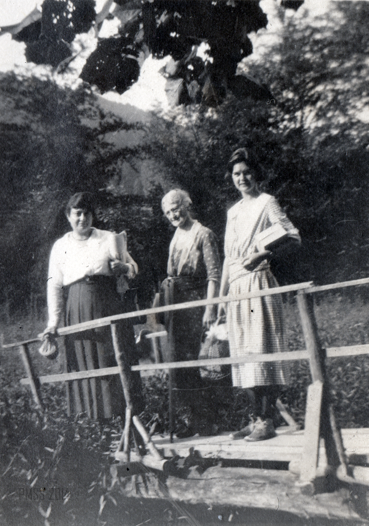 - Maya Sudo Album: Three women standing on bridge. Center woman is probably Dr. Little at PMSS. [sudo_album_017b_mod.jpg]