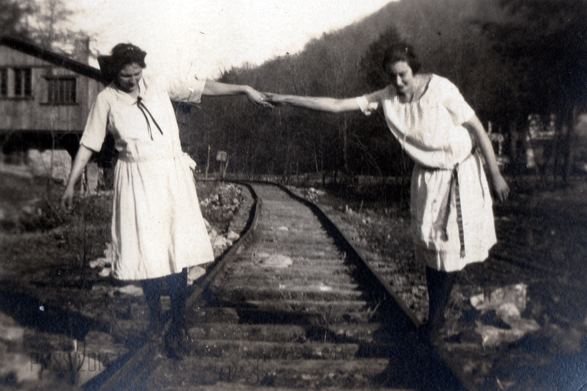 - Maya Sudo Album: Two women balancing on railroad track in front of old Boy’s Industrial. 019b