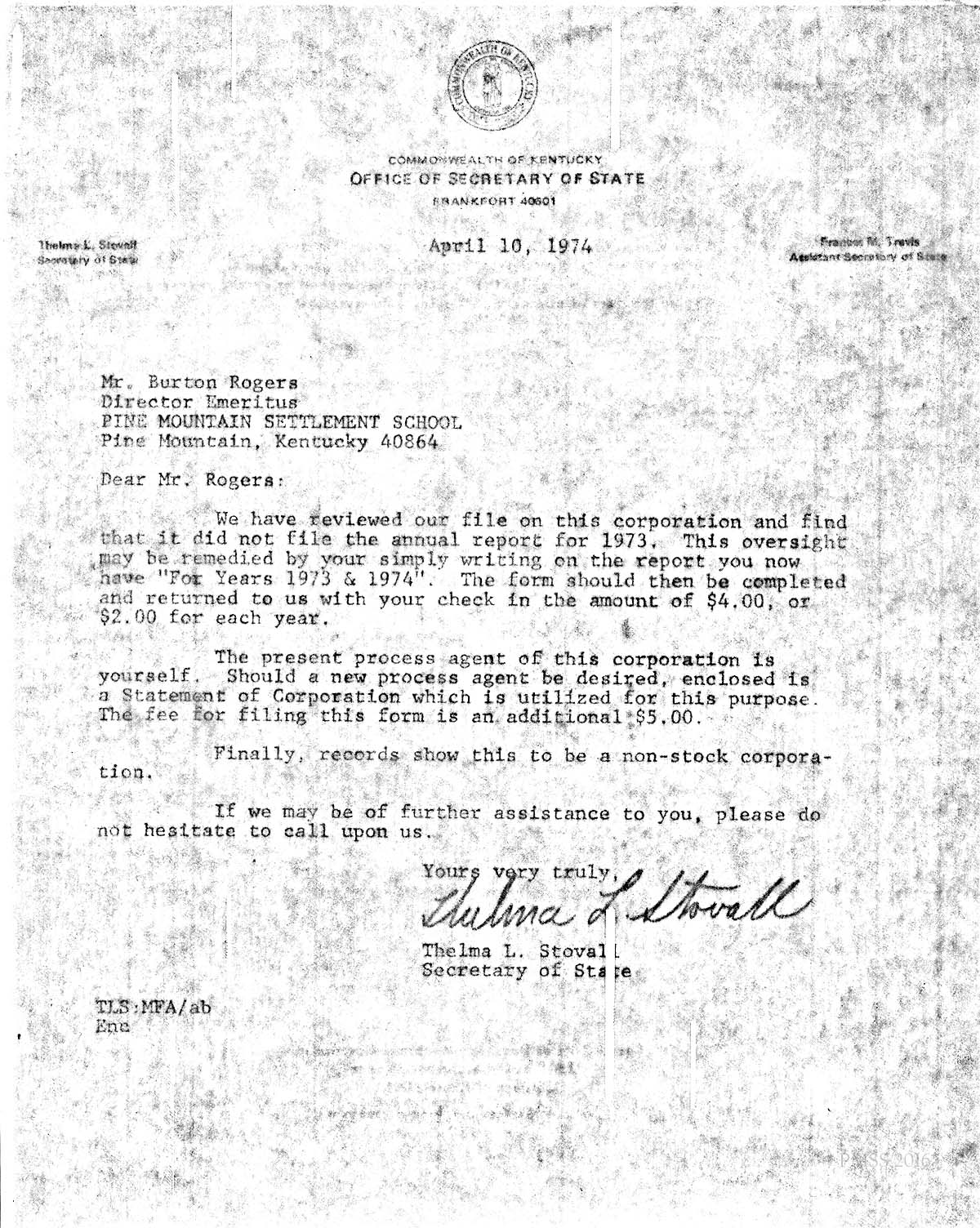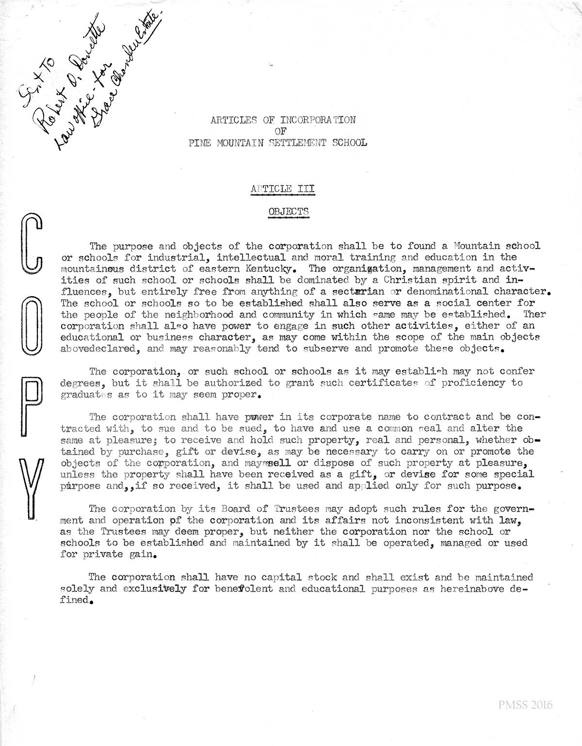 TAGS: Articles of Incorporation ; governance ; Pine Mountain Settlement School administration ; administration ; PMSS Board of Trustees ; Elizabeth Hench ; Statement of Corporation ; certificate ; Burton Rogers ; board reports ; board meetings ; stockholders ; General Advisory Board ; executive committees ; membership certificates ; treasurers ; contributions ; receipts ; pledges ; fundraising ; objects ; certificates of proficiency ; Secretary of State ; Corporate Process Agent Certificate ; Alvin Boggs ;
