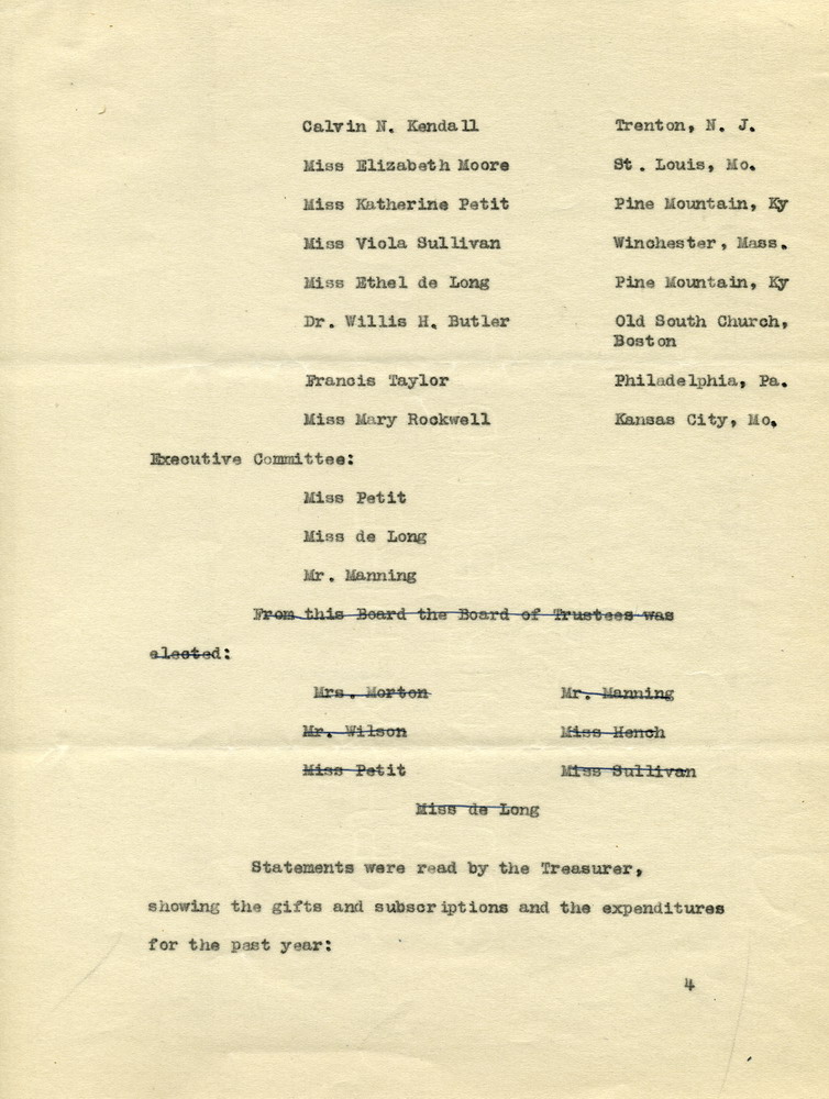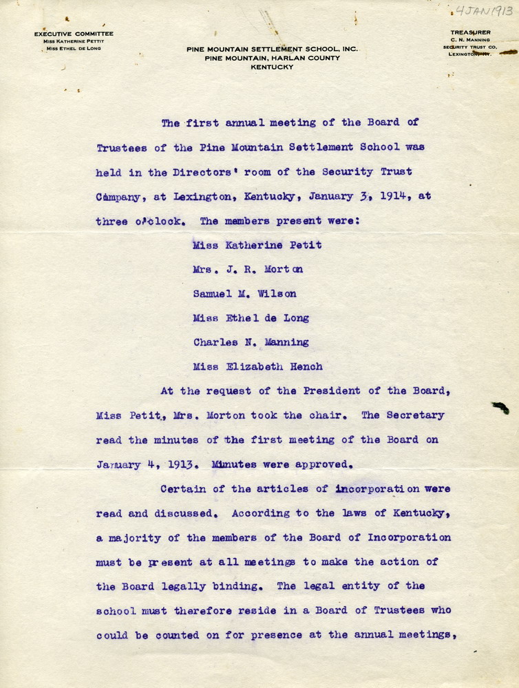 The first annual meeting of the Board of Trustees of the Pine Mountain Settlement School was held in the Directors’ room of the Security Trust Company, at Lexington, Kentucky, January 3, 1914, at three o’clock. The members present were: