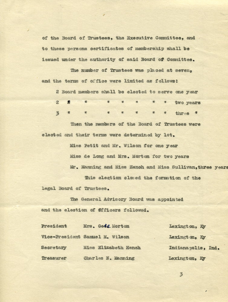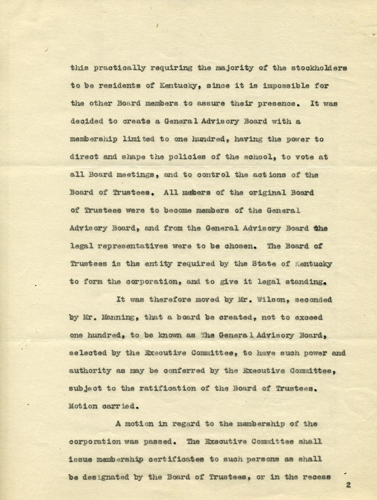 …this practically requiring the majority of the stockholders to be residents of Kentucky, since it is impossible for the other Board members to assure their presence. It was decided to create a General Advisory Board with a membership limited to one hundred, having the power to direct and shape the policies of the school, to vote at all Board meetings, and to control the actions of the Board of Trustees. All members of the original Board of Trustees were to become members of the General Advisory Board, and from the General Advisory Board the legal representatives were to be chosen. The Board of Trustees is the entity required by the State of Kentucky to form the corporation, and to give it legal standing.