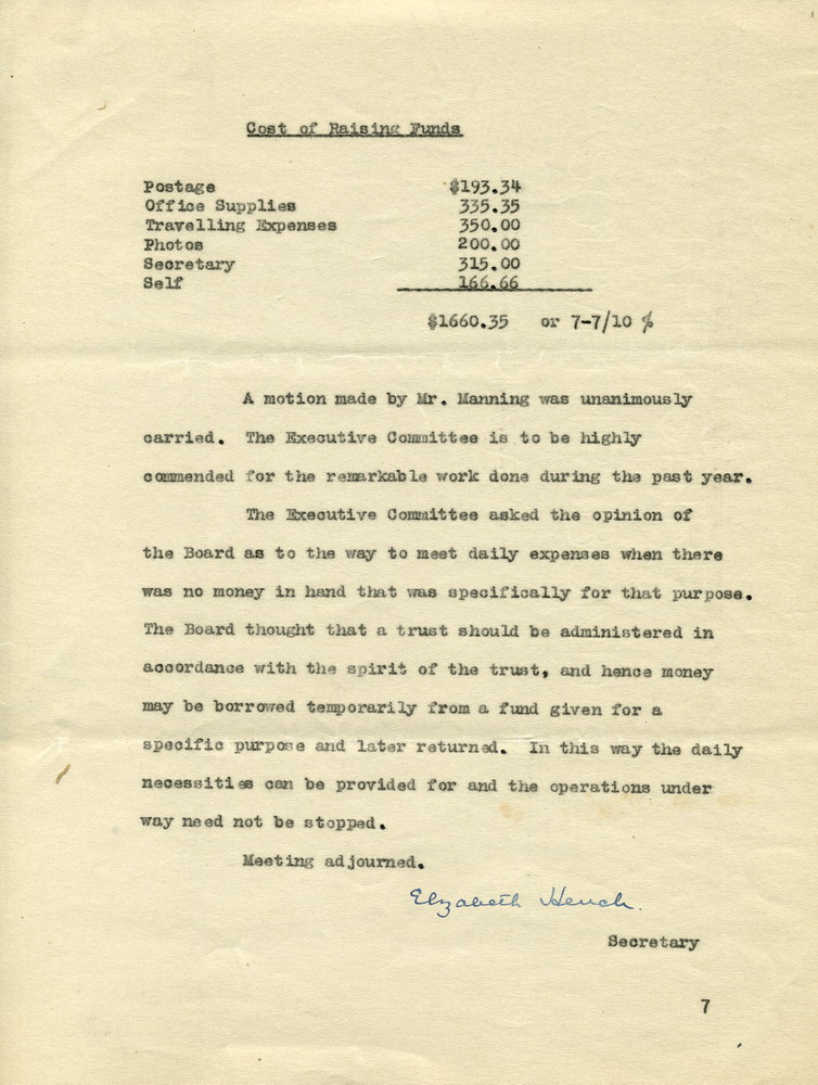 The Executive Committee asked the opinion of the Board as to the way to meet daily expenses when there was no money in hand that was specifically for that purpose. The Board thought that a trust should be administered in accordance with the spirit of the trust, and hence money may be borrowed temporarily from a fund given for a specific purpose and later returned. In this way the daily necessities can be provided for and the operations under way need not be stopped.