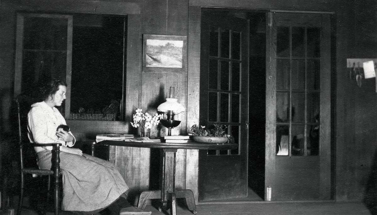- Far House I interior with May Ritchie seated. Angela Melville Album II. Part IlI. “May Ritchie at Far House.”[melv_II_album_103.jpg]