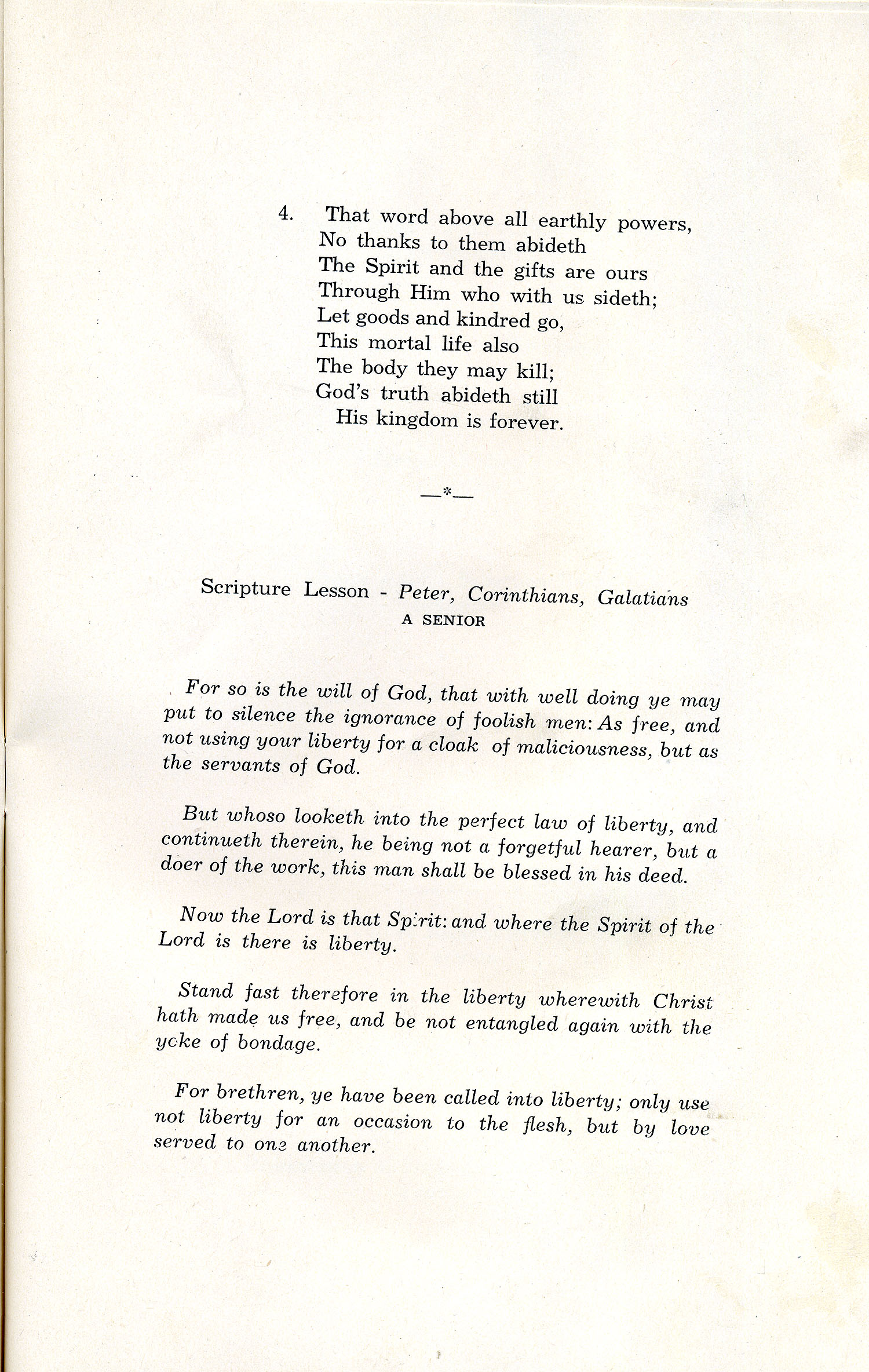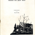 “Freedom Our Great Trust” — Images and transcription of the 7-page 1942 commencement program including prayers, short speeches, music, hymns, and lists of participants and class members.