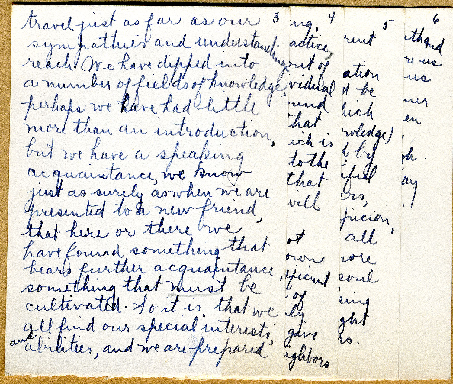 A Philosophy of Freedom”  by Birdena Bishop — Images and transcription of the original 6-page handwritten draft of the speech given by Miss Bishop at the 1942 commencement.