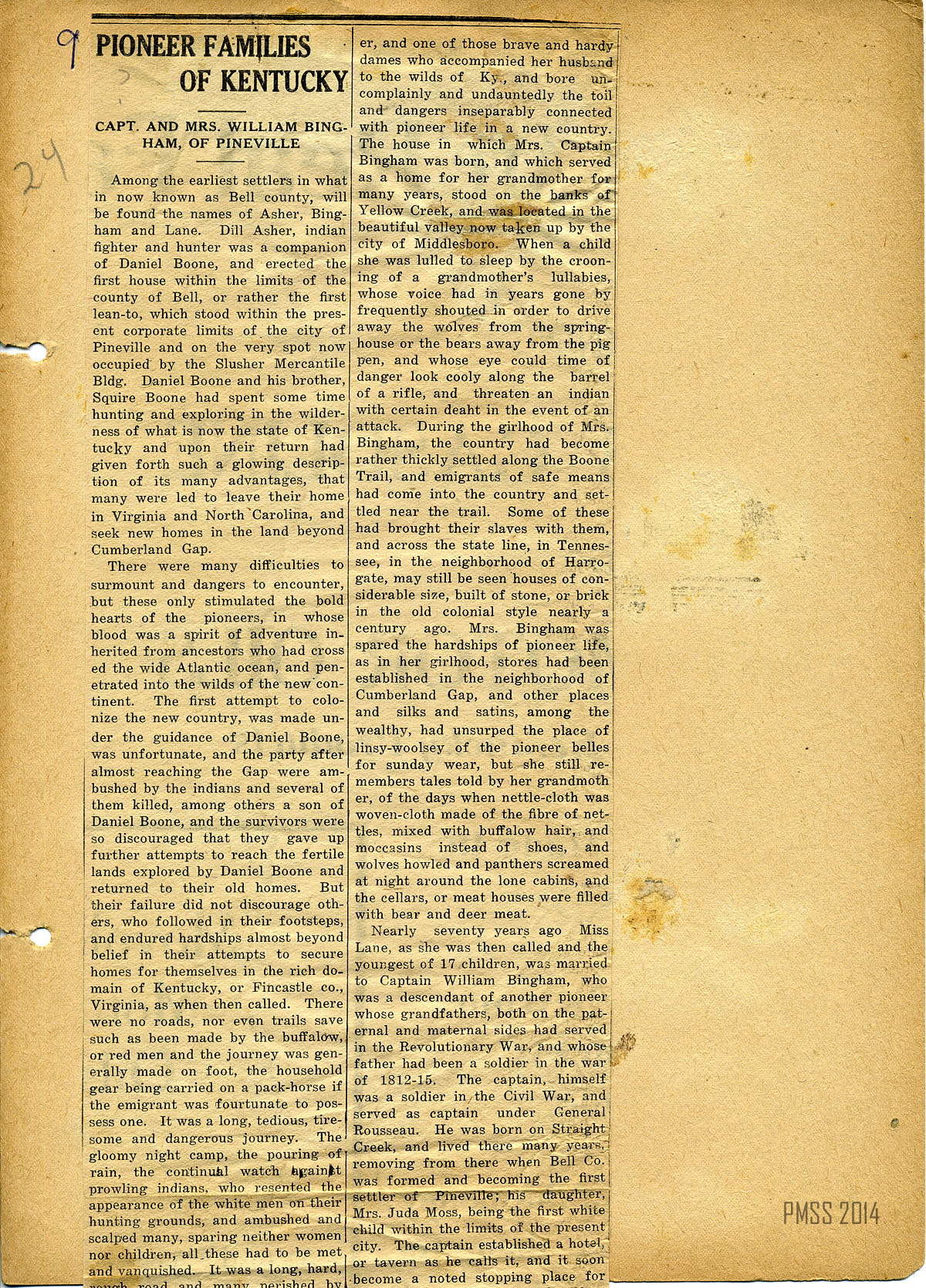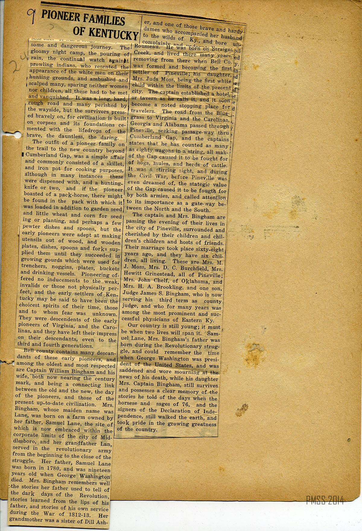 “Pioneer Families of Kentucky.” Capt. and Mrs. William Bingham of Pineville. The earliest settlers of Bell County. Related to Bingham, Asher, Lane. Dill Asher was a companion of Daniel Boone. [Newspaper source unknown]