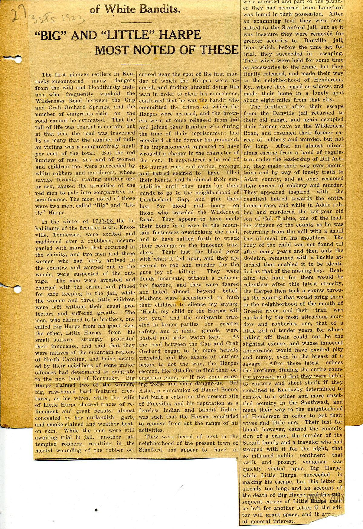 “Cumberland Gap and Wilderness Road: Indian Outrages Succeeded by Those of White Bandits. “Big” and “Little” Harpe Most Noted of These” [See: #1] ) [Page 14]