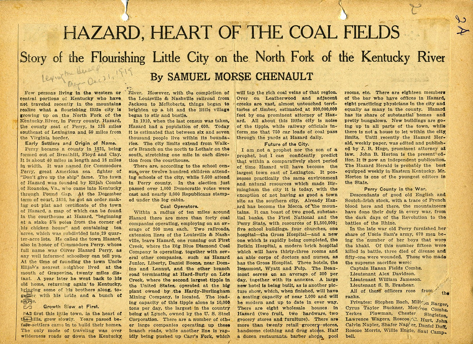 Hazard, Kentucky ; Perry County, Kentucky ; coal ; coal mining ; Samuel Morse Chenault ; Elijah Combs ; North Fork Kentucky River ; established Perry County in 1821 ; Perry formed from part of Breathitt, Floyd and Clay Counties ; Hazard, “beginning at a stake 5 1/2 poles from the corner of his chicken house …” ; Commodore Oliver Hazard Perry ; Grapevine, Ky ; L & N Railroad ; 1910 census showed 600 population ; 1919 c. 6000-7000 population ; bounded by Walker’s Branch on north and Lothair on south ; school in city has 1,200 students ; Perry County schools has 7,500 students ; 1,000 Democrats and 3,000 Republicans ; 40 coal companies ; Blue Diamond Coal Company ; Hazard Junior Coal Company ; Liberty Coal Company ; Daniel Boone Coal Company ;Hard Burley, Ky ; Domino, Ky ; Lennut, Ky ; Lots Creek, Ky ; Hardy-Burlingham Coal Company ; U.S. Steel Corporation, Lynch, Ky ; Carr’s Fork, Ky ; Leatherwood, Ky ; 300,000,000 feet of timber in area ; tipples ; 750 car-loads of coal by rail daily at Hazard, 1919 ; predicts Hazard will become largest city east of Lexington ; First National bank ; Perry State bank ; bank resources of $1,500,000 ; 5 school buildings ; 4 churches ; Gross Hospital ; Botkin Hospital under construction ; Beaumont Hotel ; Fulp Hotel ; Wyatt Hotel ; movie theaters ; 8 wholesale houses ; 20 retail grocery stores ; pool rooms ; 18 lawyers ; 8 doctors ; rental at capacity in 1919 ; Hazard Herald newspaper owned by J.B. Hoge, editor, John B. Horton ; English, Scotch-Irish “with trace of French blood” ; WWI soldiers: Captain Hanan Fields Combs ; Lieutenant Alex Davidson ; Lieutenant William Jameson ; Lieutenant S.B. Brashear ; Stephen Bach; Milton Barger, Cyrus Taylor Buckner; Monroe Combs ;Yerkes Plowman ; Chester Singleton ; Lawrence Wagers ; Roscoe C, Hurt ; John Calvin Napier ; Shafer Napier ; Daniel Duff ; Roscoe Morris ; Willie Engle ; Saul Campbell.