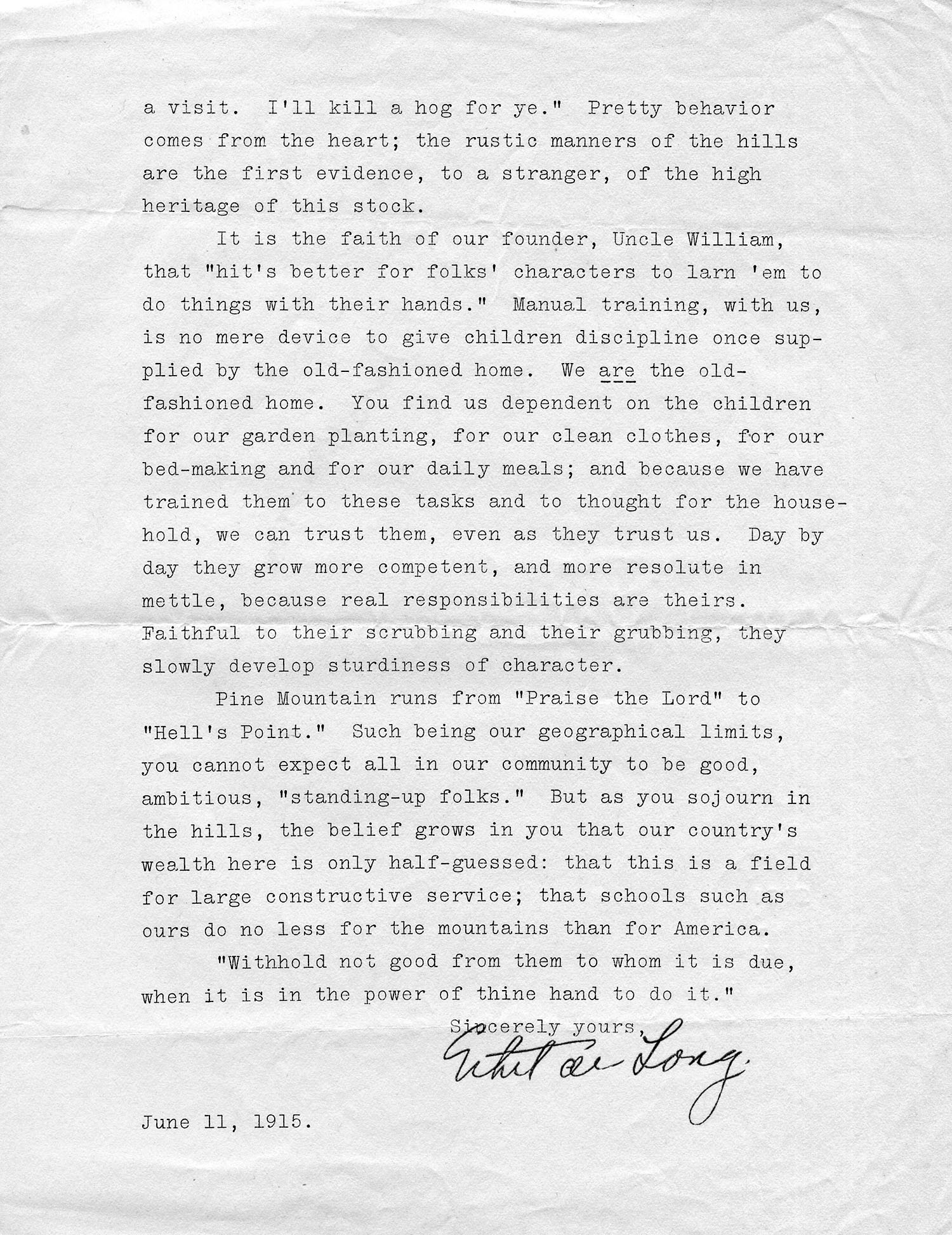 Pine Mountain runs from “Praise the Lord” to “Hell’s Point.” Such being our geographical limits, you cannot expect all in our community to be good, ambitious, “standing-up folks.” But as you sojourn in the hills, the belief grows in you that our country’s wealth here is only half-guessed; that this is a field for large constructive service; that schools such as ours do no less for the mountains than for America.