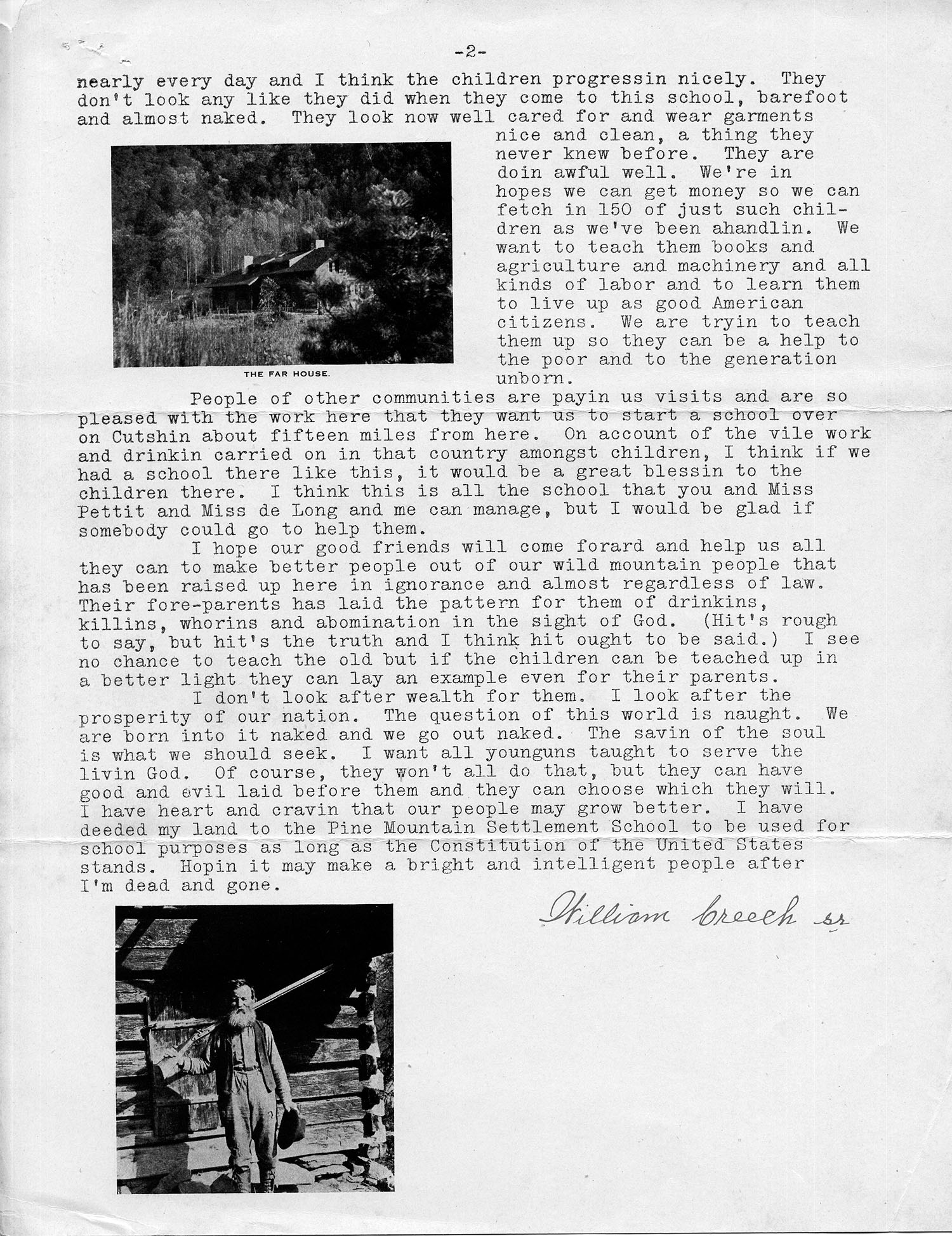 I don’t look after wealth for them. I look after the prosperity of our nation. The question of this world is naught. We are born into it naked and we go out naked. The savin of the soul is what we should seek. I want all younguns taught to serve the livin God. Of course, they won’t all do that, but they can have good and evil laid before them and they can choose which they will. I have heart and cravin that our people may grow better. I have deeded my land to the Pine Mountain Settlement School to be used for school purposes as long as the Constitution of the United States stands. Hopin it may make a bright and intelligent people after I’m dead and gone.