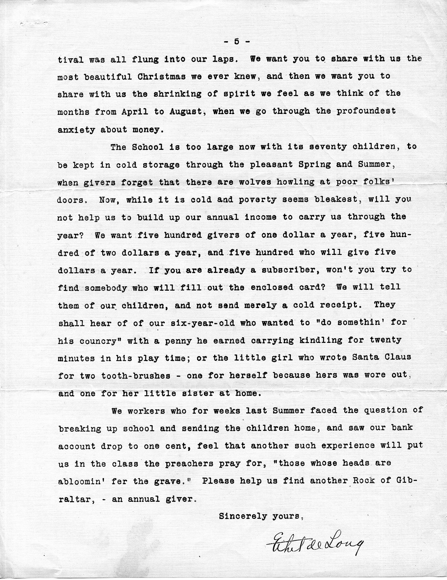 The School is too large now with its seventy children, to be kept in cold storage through the pleasant Spring and Summer, when givers forget that there are wolves howling at poor folks’ doors. Now, while it is cold and poverty seems bleakest, will you not help us to build up our annual income to carry us through the year? We want five hundred givers of one dollar a year, five hundred of two dollars a year, and five hundred who will give five dollars a year. If you are already a subscriber, won’t you try to find somebody who will fill out the enclosed card? We will tell them of our children, and not send merely a cold receipt. They shall hear of our six-year-old who wanted to “do somethin’ for his country” with a penny he earned carrying kindling for twenty minutes in his play time; or the little girl who wrote Santa Claus for two tooth-brushes — one for herself because hers was wore out, and one for her little sister at home.