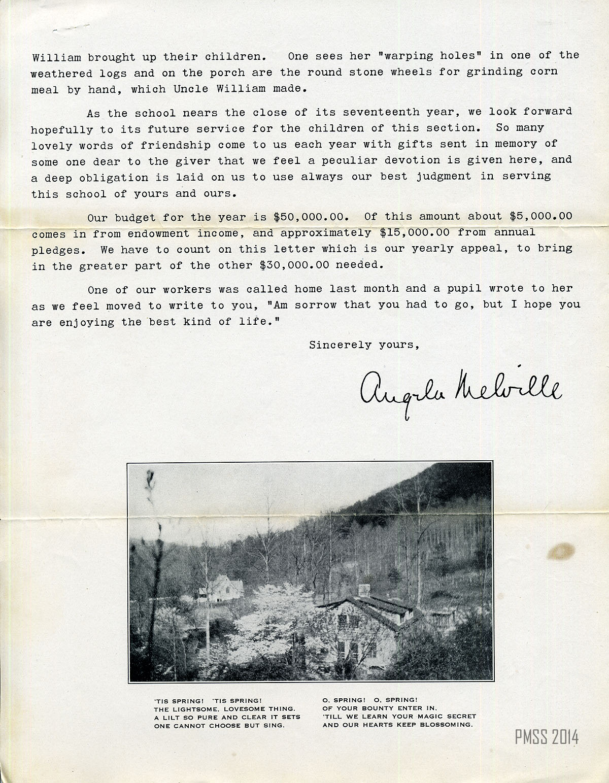 Letterhead includes names of Director, Associate Director, President of Board of Trustees, and Treasurer ; anecdote about former student’s 86-year-old grandmother and grandchild ; some improvements in 86 years in schools and playground ; the past year was good with 100-plus students, no illnesses ; electric power plant is under construction ; description of arrival of Diesel engine ; cost to complete power house ; boys’ yearly duties include clearing of fire line, milking Ayrshires ; Commencement play was a historical pageant ; school is in its 17th year ; amounts in school budget, income from endowment, annual pledges ; $30,000 still needed ; signed by Angela Melville ;