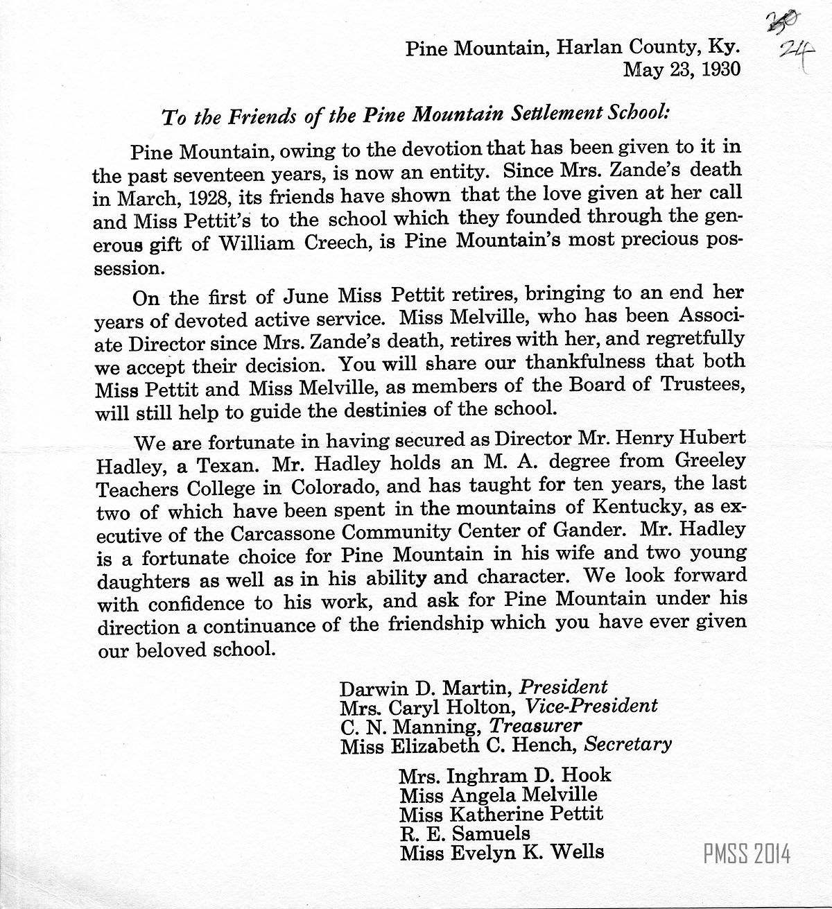 Misses Pettit and Melville to retire June 1, 1930 ; both are members of Board of Trustees ; Mr. Henry Hubert Hadley is new director ; description of Hadley’s background ; list of names of President, Vice-President, Treasurer, Secretary, and Board Members ;gALL