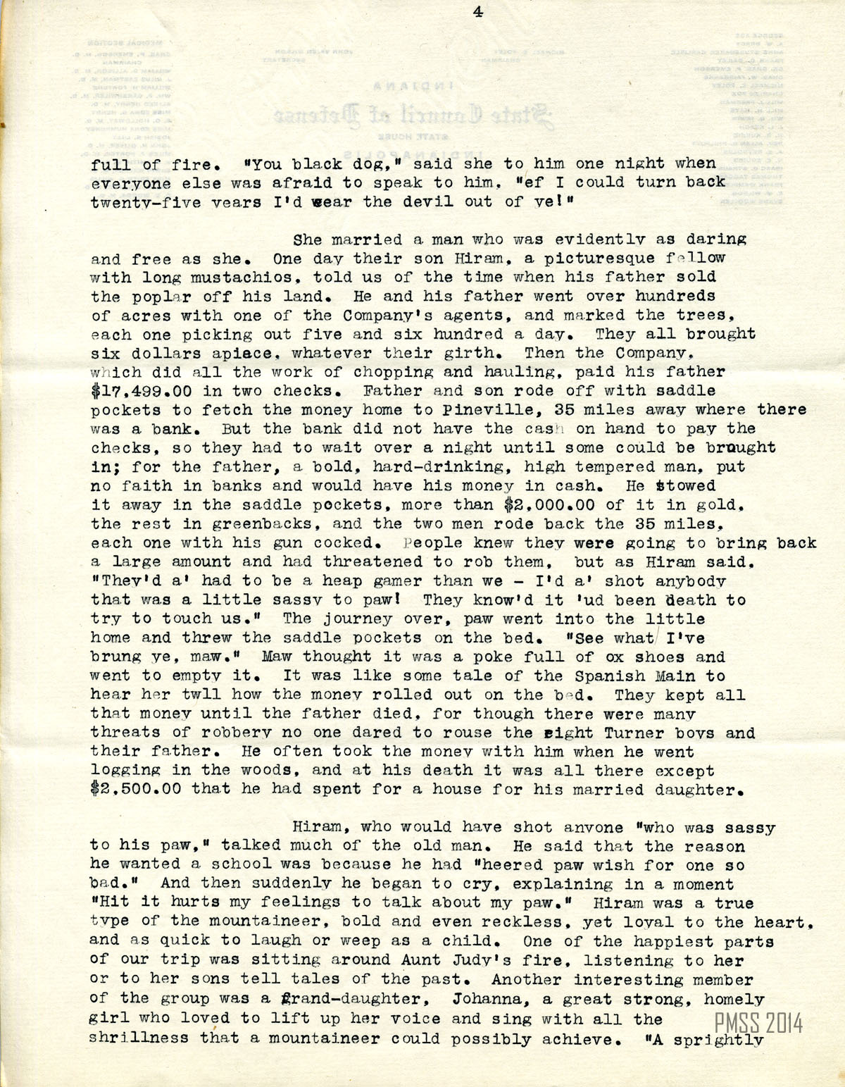 She married a man who was evidently as daring and free as she. One day their son Hiram, [Hiram Turner] a picturesque fellow with long mustachios, told us of the time when his father sold the poplar off his land. He and his father went over hundreds of acres with one of the company’s agents, and marked the trees, each one picking out five or six hundred a day. They all brought six dollars apiece, whatever their girth. Then the company, which did all the work of chopping and hauling, paid his father $17,499.00 in two checks. Father and son rode off with saddle pockets to fetch the money home to Pineville, 35 miles away where there was a bank. But the bank did not have the cash on hand to pay the checks, so they had to wait over a night until some could be brought in; for the father, a bold, hard-drinking, high tempered man, put no faith in banks and would have his money in cash. He stowed it away in the saddle pockets, more than $2,000.00 of it in gold, the rest in greenbacks, and the two men rode back the 35 miles, each one with his gun cocked. People knew they were going to bring back a large amount and had threatened to rob them, but as Hiram said, “They’d a’ had to be a heap gamer than we — I’d a’ shot anybody that was a little sassy to paw! They know’d it ‘ud been death to try to touch us.” The journey over, paw went into the little home and threw the saddle pockets on the bed. “See what I’ve brung ye, maw.” Maw thought it was a poke full of ox shoes and went to empty it. It was like some tale of the Spanish Main to hear her tell how the money rolled out on the bed. They kept all that money until the father died, for though there were many threats of robbery no one dared to rouse the eight Turner boys and their father. He often took the money with him when he went logging in the woods, and at his death it was all there except $2,500.00 that he had spent for a house for his married daughter.