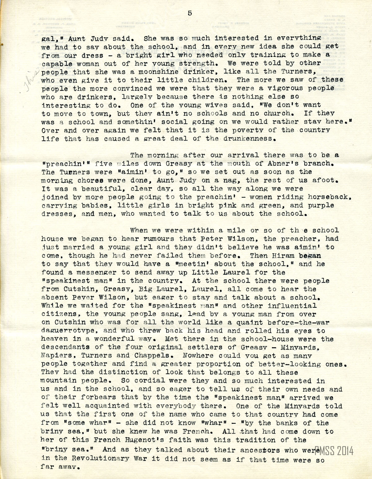 The Hindman group started out on a November morning in a wagon driven by Guilford, a Hindman student, and traveled from one creek to another. When they stopped at the gap to rest the horses and eat their dinner, a neighbor came with horse feed and told stories about his children and their meager education because they lived so far from a school. She describes the homes along Bull Creek as “miserable.”