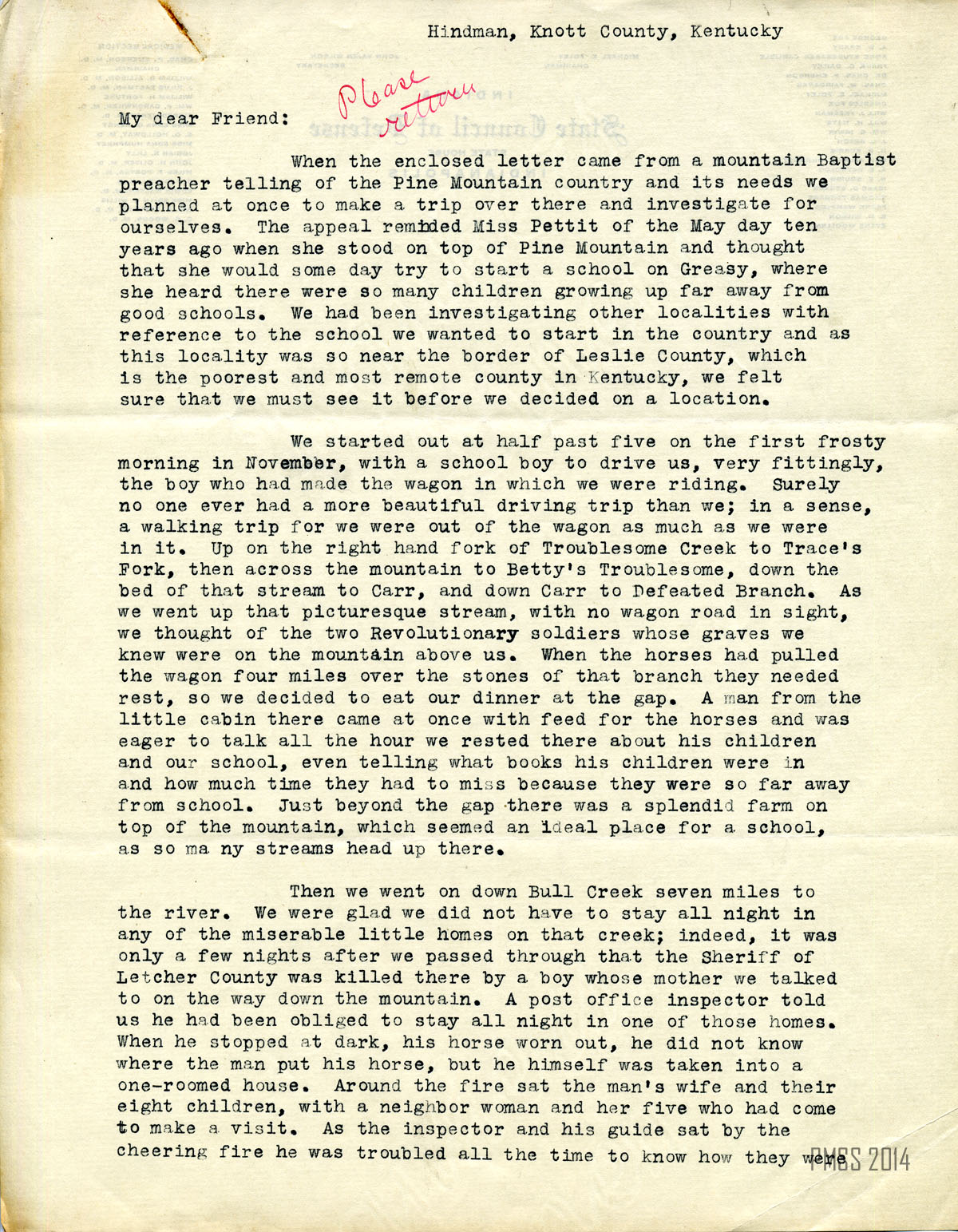 “Dear Friend” Letter – c. 1911, Hindman, Knott County, Kentucky