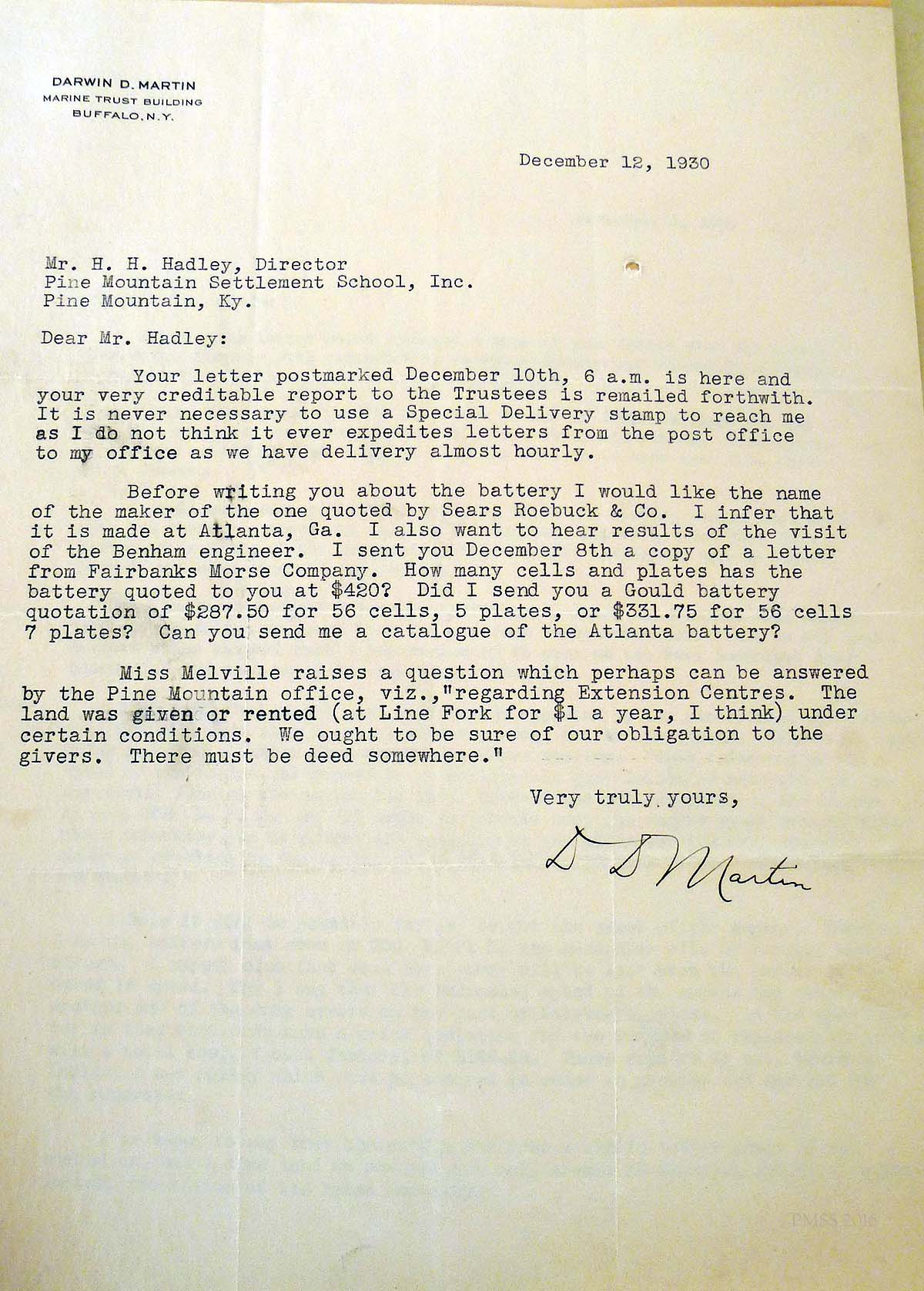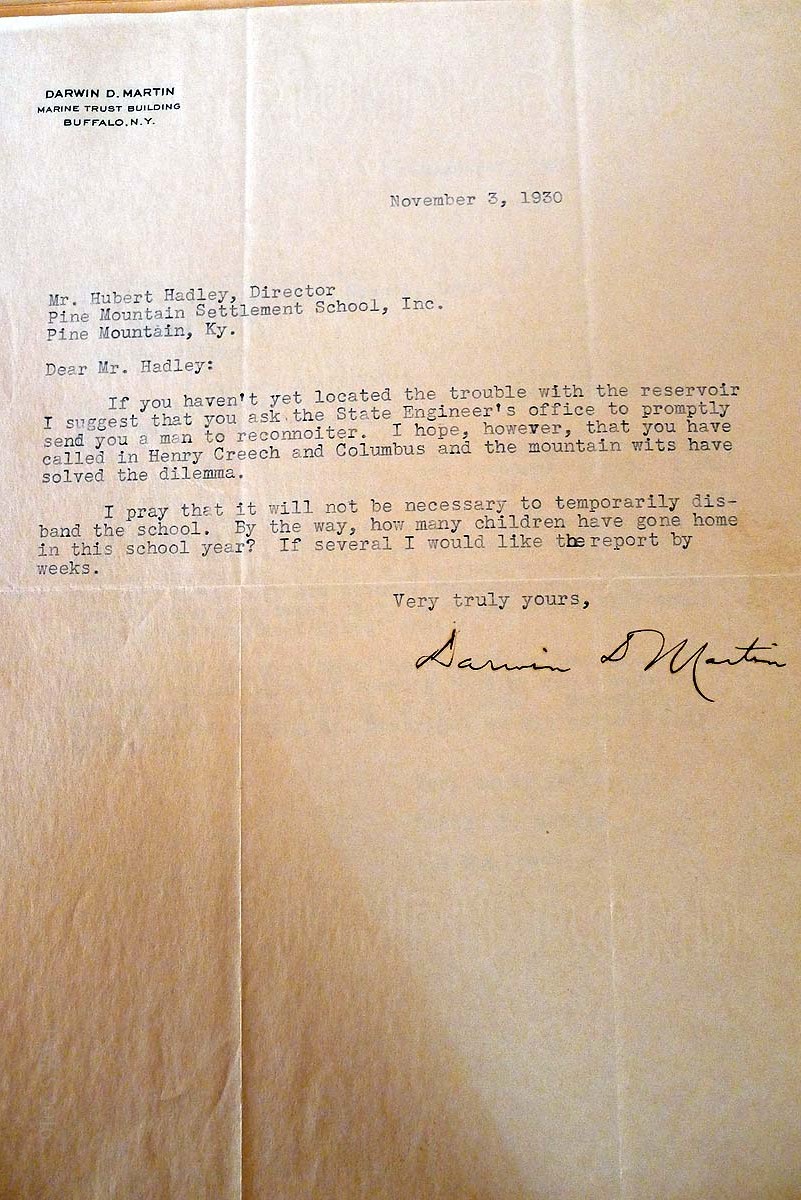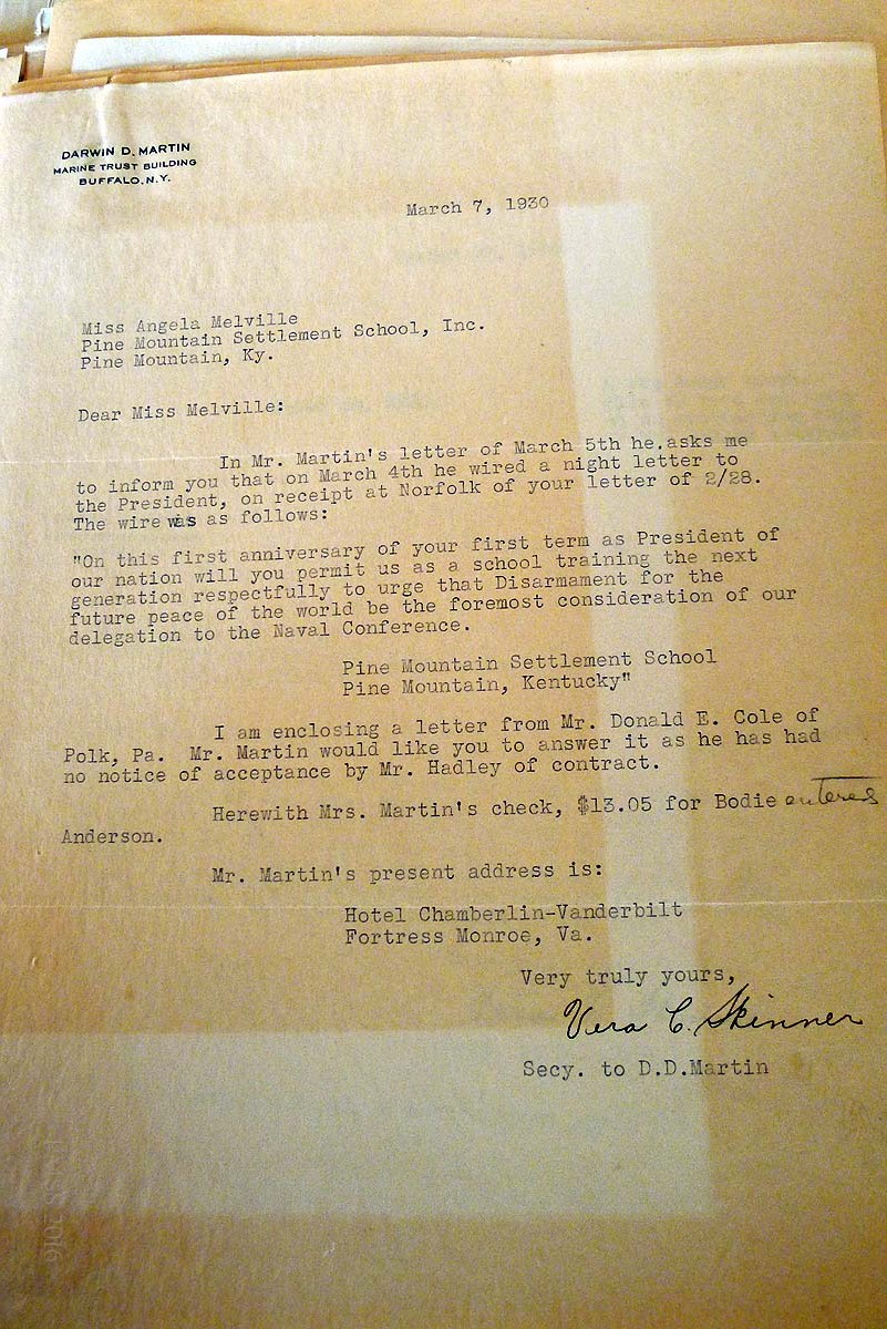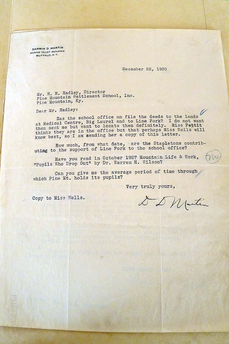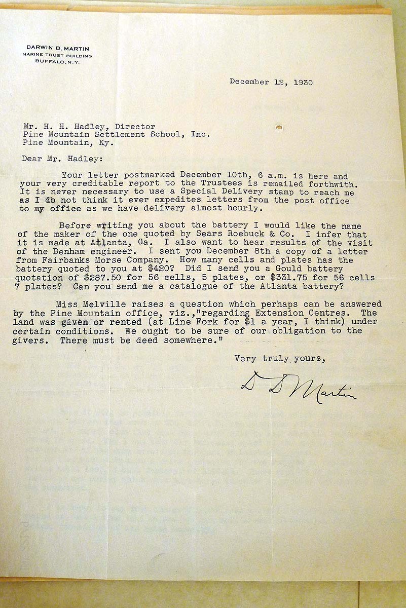 DARWIN D. MARTIN 1930 CORRESPONDENCE provides images, contents and transcriptions of 1930 letters to and from Darwin D. Martin, a member of the Board of Trustees at Pine Mountain Settlement School, 1920-1933, and a generous contributor to and consultant for the School. He was an executive of the Larkin Co. in Buffalo, New York.