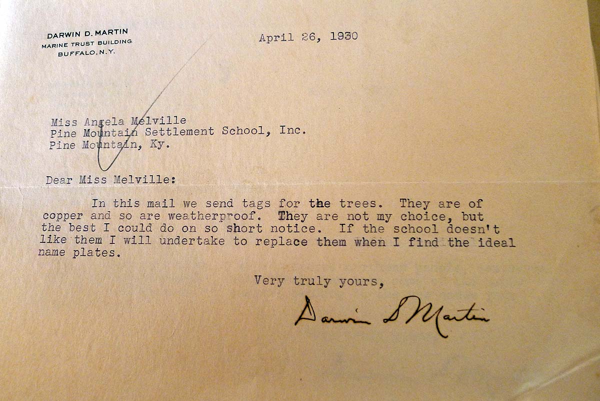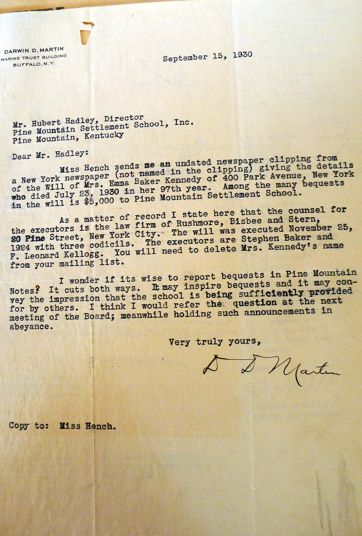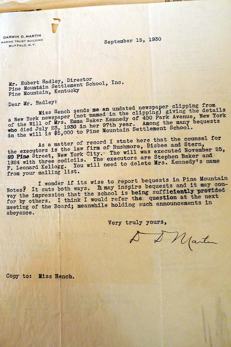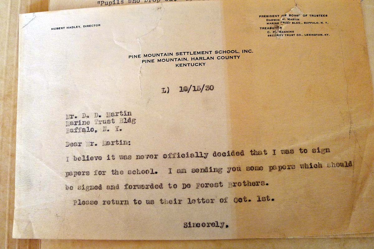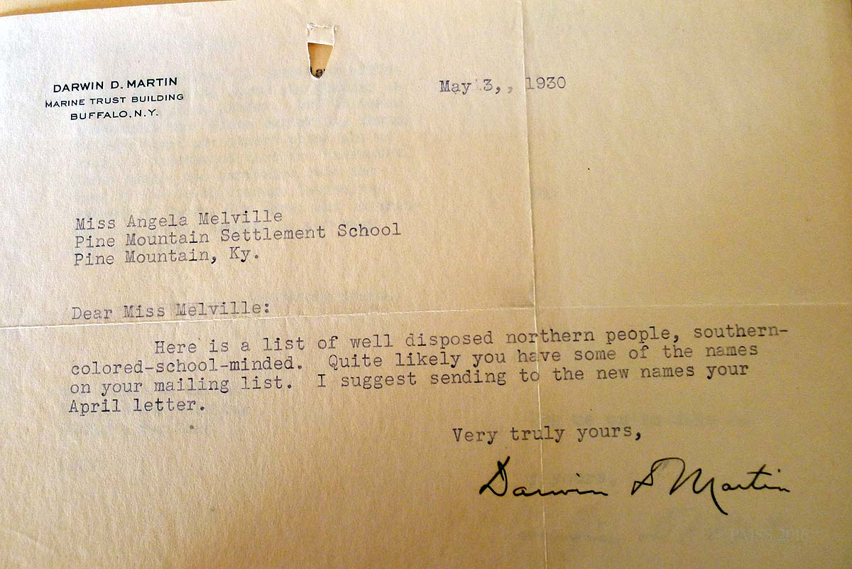DARWIN D. MARTIN 1930 CORRESPONDENCE provides images, contents and transcriptions of 1930 letters to and from Darwin D. Martin, a member of the Board of Trustees at Pine Mountain Settlement School, 1920-1933, and a generous contributor to and consultant for the School. He was an executive of the Larkin Co. in Buffalo, New York.