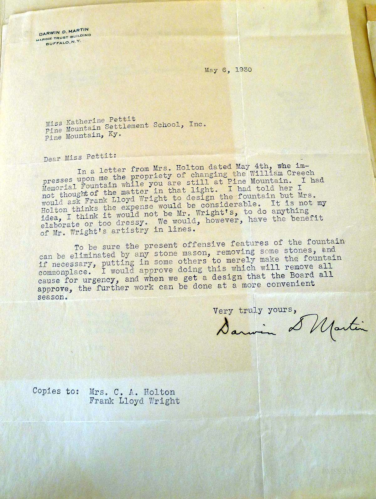 In a letter from Mrs. Holton [Celia Cathcart Holton] dated May 4th, she impresses upon me the propriety of changing the William Creech Memorial Fountain while you are still at Pine Mountain. I had not thought of the matter in that light. I had told her I would ask Frank Lloyd Wright to design the fountain but Mrs. Holton thinks the expense would be considerable. It is not my idea, I think it would not be Mr. Wright’s, to do anything
