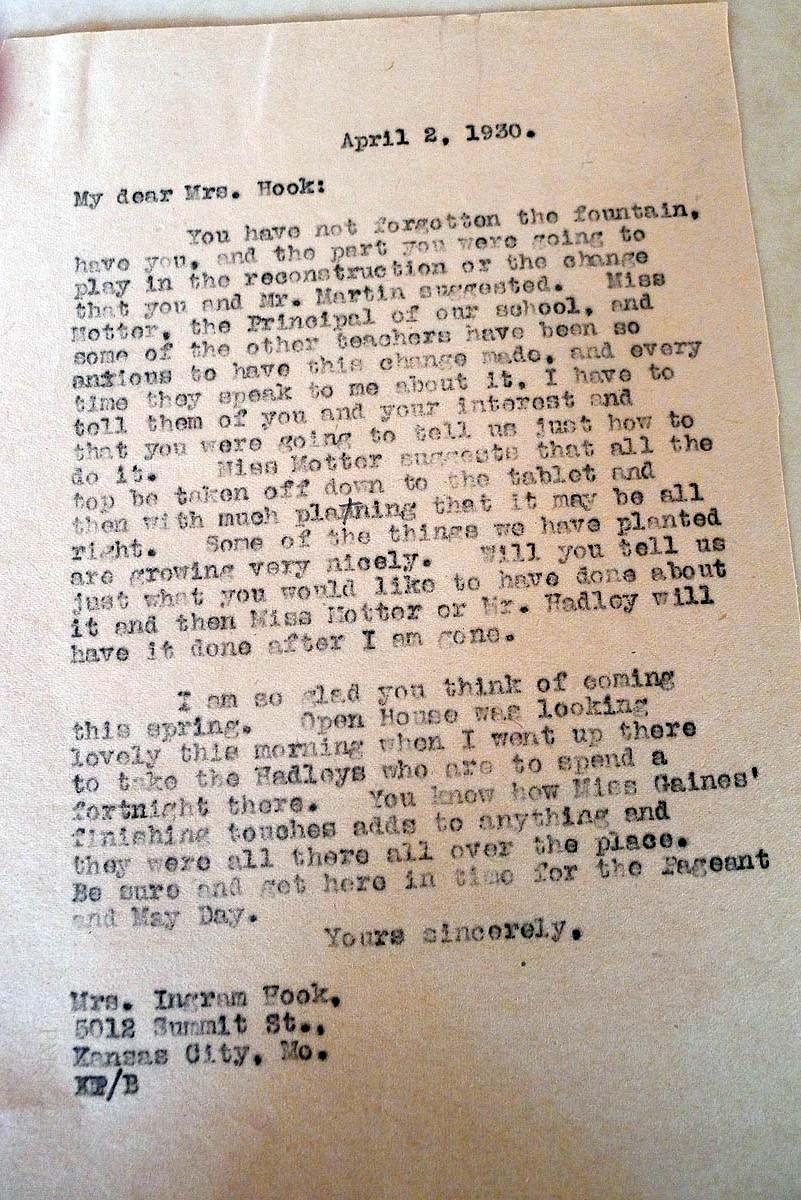 “KP” asks Mrs. Mary Rockwell Hook for her suggested changes to the William Creech Memorial Fountain; teachers’ suggestions; welcomes her upcoming visit.