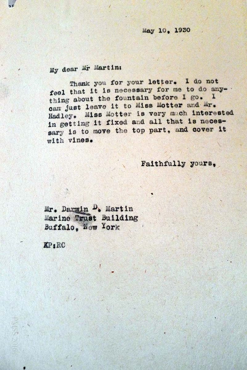 I told him I had written Mary Hook at least three times during the last two years about the fountain. I think she wants something to be done about it, but does not want the responsibility of doing it. I told Mr. Martin I was willing to assume the authority, – was he? – of directing you and Miss Melville to make whatever changes in the fountain you saw fit. To that, he says, “Frank Lloyd Wright will pass through Buffalo very soon, en route to or from Princeton University, where he will deliver a course of lectures on Art, Archaeology and Architecture. This should qualify him to design a fountain. I will ask him to do so and believe he will though his muse does not respon[d] “off the bat.'” Today I am writing him that I feel it is not necessary to go to the bother and expense of asking Mr. Wright to design a fountain, as the one we have can easily be changed sufficiently so as not to be objectionable, by removing the stones which horribly resemble a countenance and substituting others which will simply allow the passage of the water; that you are eager to have the work done before you leave, as Mr. Hadley will be busy with many things and may not get around to such a detail as this for months. I shall ask Mr. Martin to write you directly. This business of relaying questions and answers through me is a cumbersome method which requires much time. It is not always possible for me to write the letters immediately, much as I should like to.