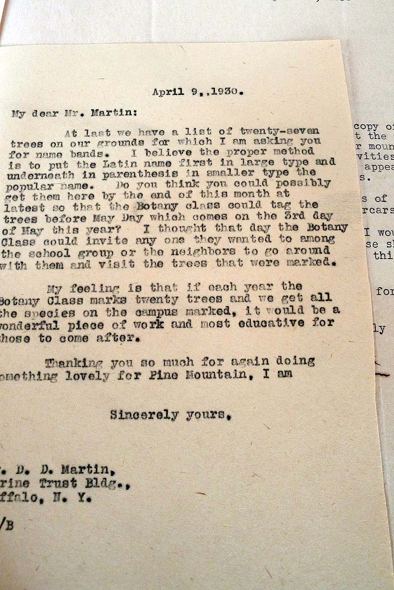 Unsigned copy of letter [probably from Angela Melville] to Mr. Martin requests name bands for a list of 27 trees on the Pine Mt. grounds. Asks if they can be delivered before May Day so that the Botany Class can put them to use, with the hope that 20 trees can be marked each year.