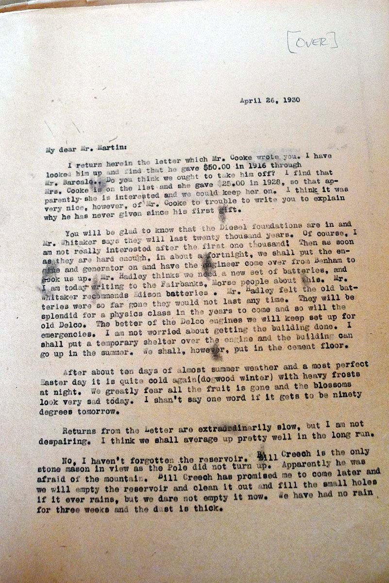 The writer of this unsigned copy of letter [probably from Angela Melville] to Mr. Martin returns Mr. Cooke’s letter to him and asks advice on whether to keep his name as a donor. She reports that the Deisel foundations are in and describes the next steps, the need for new batteries, and future uses for the old Delco engines. Responses to the “Letter” are slow; Bill Creech, stone mason, will repair the reservoir; accompanied Columbus Creech on survey of mountain about mineral rights the school is getting; asks for address for Miss Janet Danforth.