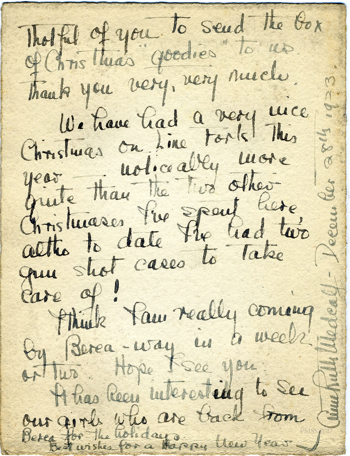 I think I am really going by Berea – way in a week or two. Hope to see you. It has been interesting to see our girls who are back from Berea for the Holidays. Best wishes for a Happy New Year. Anne Ruth Medcalf, December 28th, 1923.