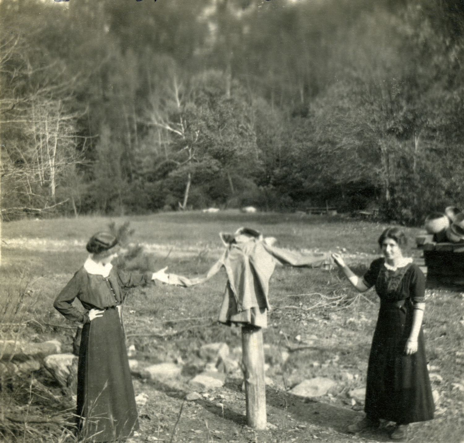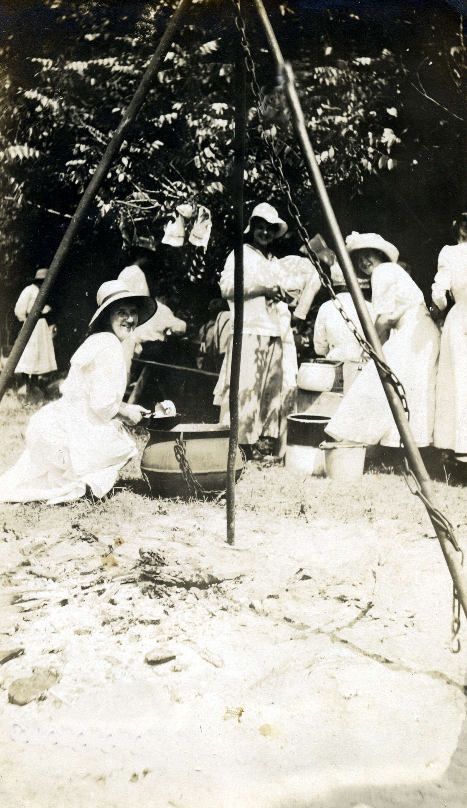 - Ethel de Long to the left of the iron pot and tripod, serving food. [X_099_workers_2494a_mod.jpg]