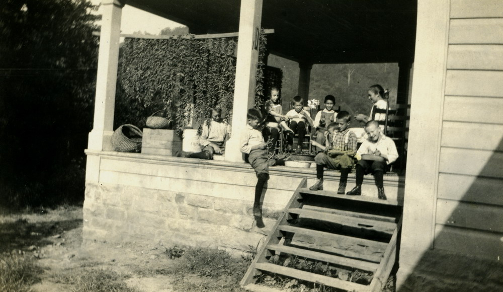 - Frances Lavender Album. Bean Stringin’. Beans drying. Dining Room [Old Laurel House] Porch. October 1918. [lave038.jpg]
