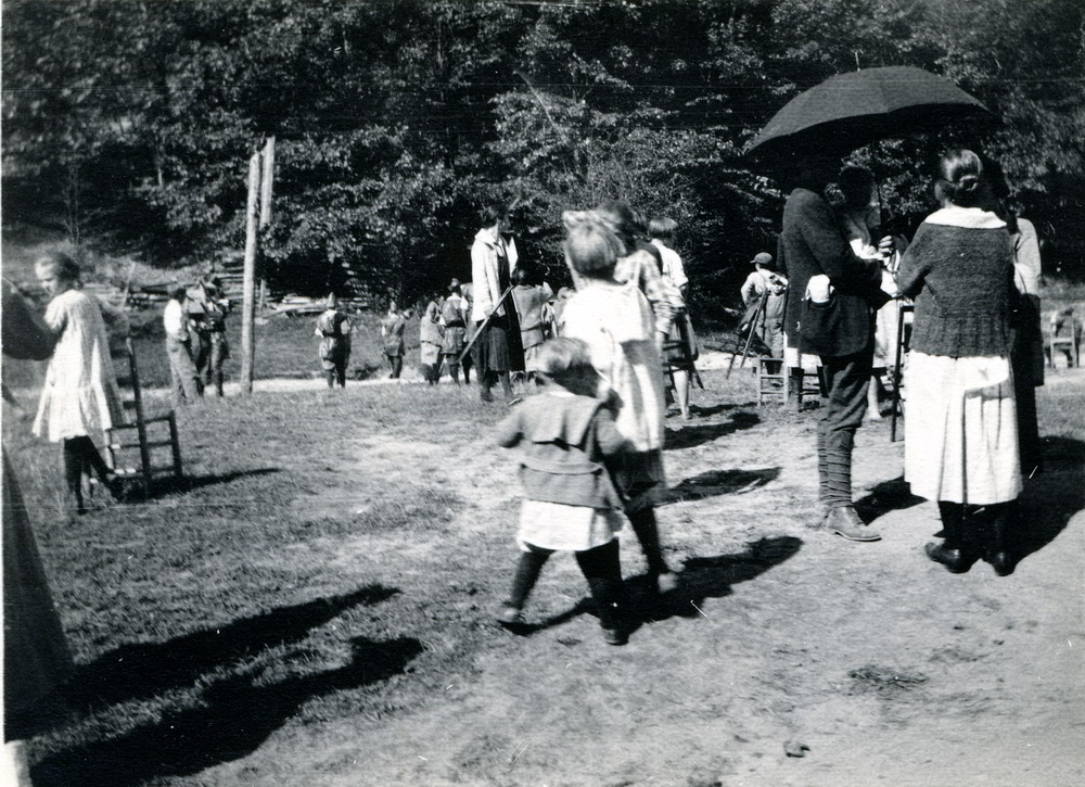 - Pettit ?, seated with hat. Frances Lavender Album. Fair Day. Sept. 19, 1918. “First picture ever caught of K[atherine] Pettit [standing in background, center]. 1. Duncan Foster, teacher; 2. H. Babsen, Housemother; 3. Miss Benedict, Kitchen; 4. P. Peck, my room-mate; 5. A Mt. woman; 6. Miss [Katherine] Pettit; 7. Mrs. Holton, a teacher; 8. A Mt. woman (Mrs. Day); Mrs. Zande is in the background sitting on a table with head down, knitting.” [lave026.jpg]