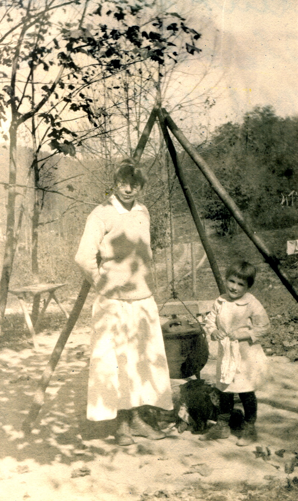 lave_023 Mrs. Fagg’s little boys at Old Log House. Where I used to live. Notice 2 mill stones in fore-ground. These boys are simply adorable. lave023.jpg (1408492 bytes)
