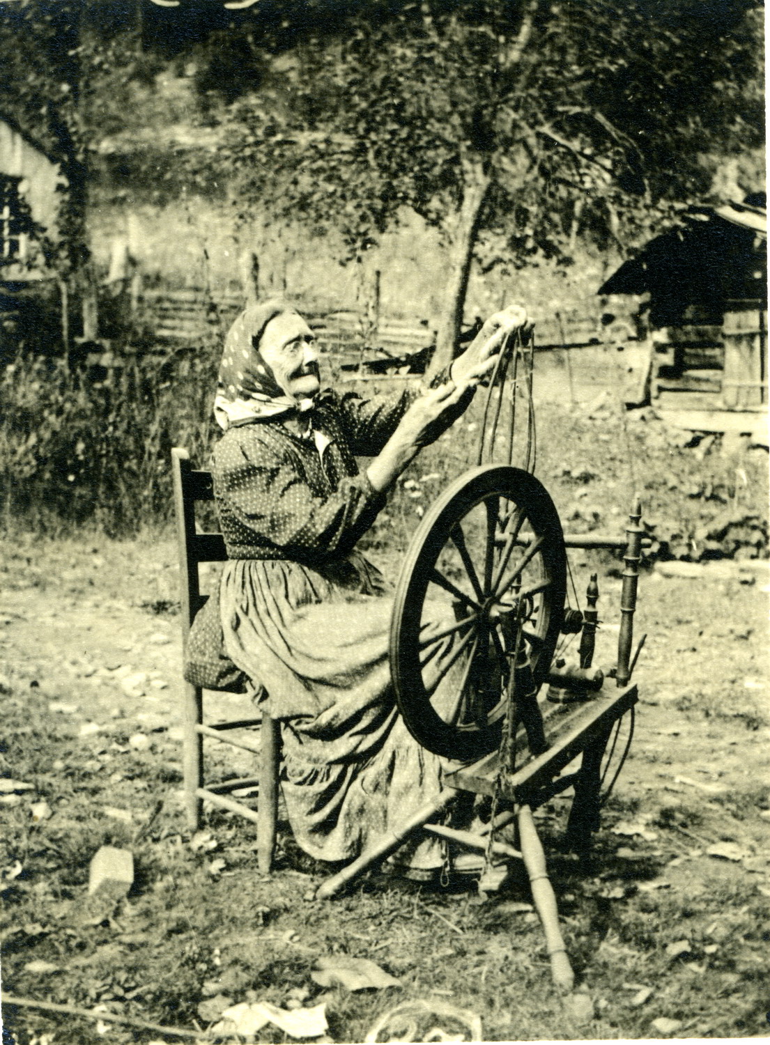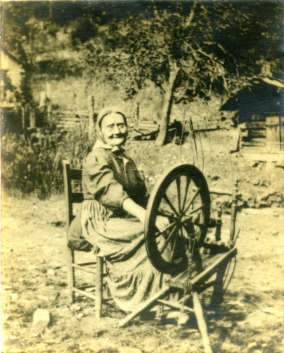 - Frances Lavender Album. Aunt Lear (Leah) spinning. — See wool laying on the wheel and her hand in motion. [lave018.jpg]