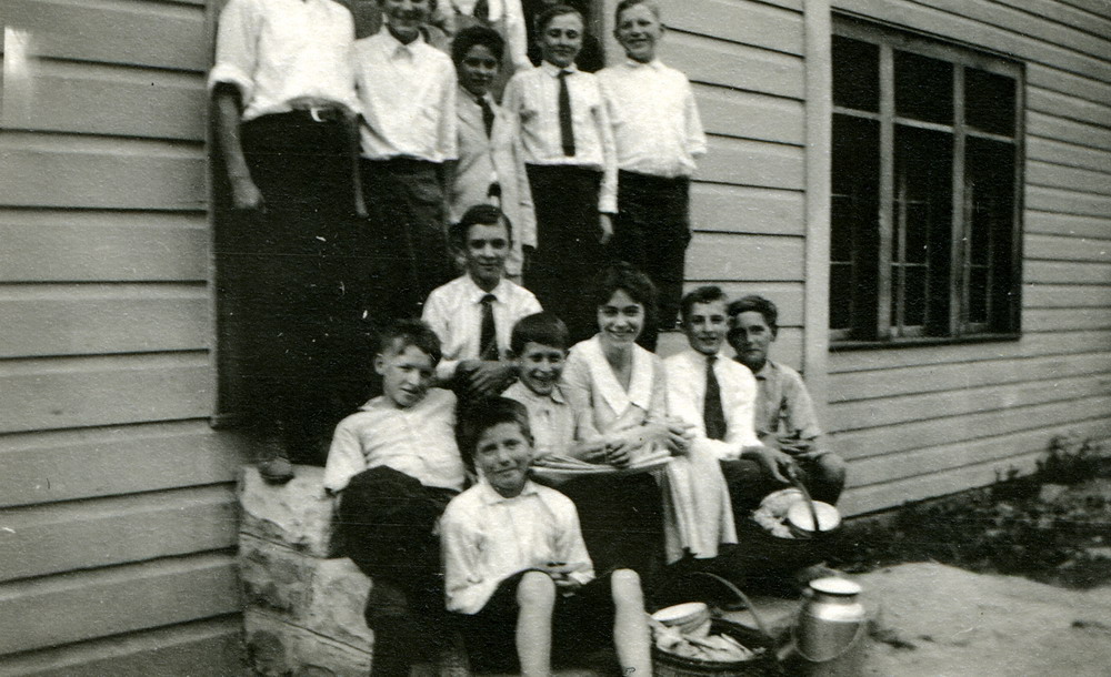 lave_042 Mrs. [Celia Cathcart] Holton and some of the School House boys with their supper at their feet. [Celia Cathcart Holton was a teacher from 1915 – 1919] lave042.jpg (193885 bytes)